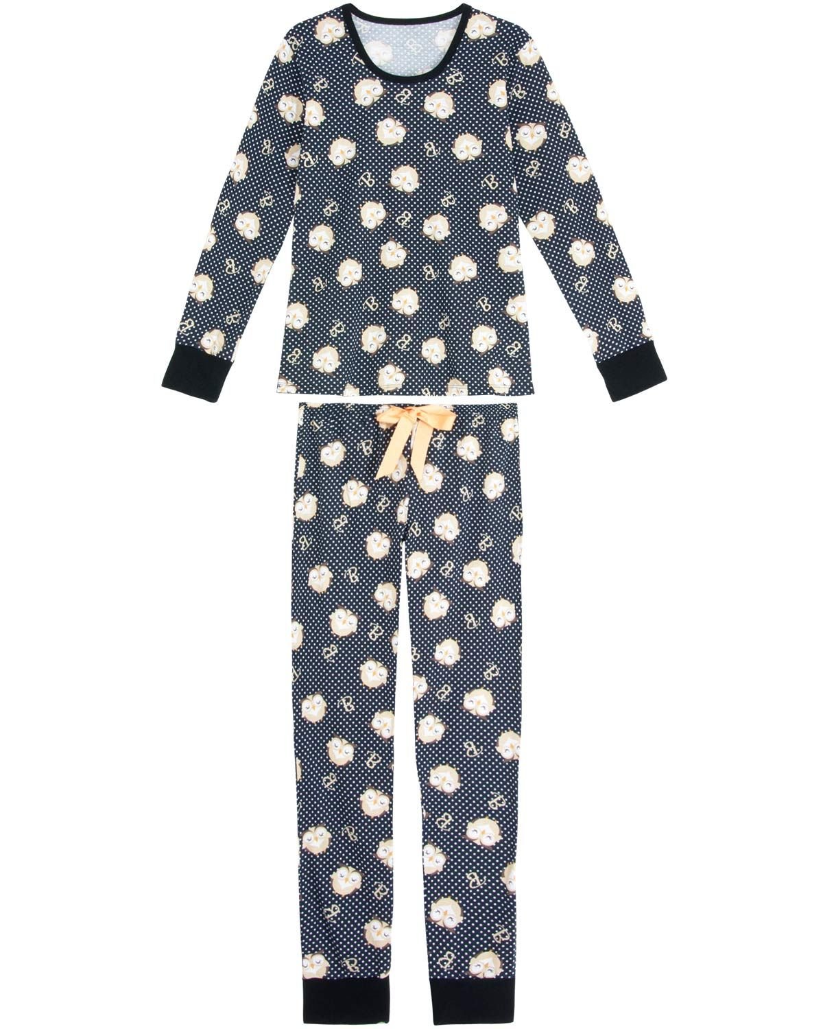 Ideal para escolhas fáceis e femininas, este pijama é todo feito em malha incorpada, com blusa manga longa e calça comprida com punhos, todo com estampa moderna e graciosa de bolinhas e corujas, conferindo o visual jovem e moderno da peça. Perfeito para colorir o cotidiano com muito conforto.