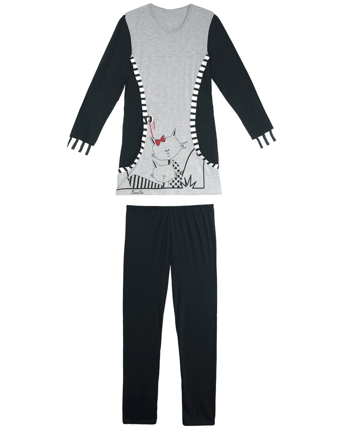 O pijama uni o conforto da viscose e calça legging com a modernidade da estampa alegre de gatinhos com detalhes em listras e bolso canguru, trazendo beleza e priorizando o conforto para suas noites. Delicado, feminino e moderno na medida.