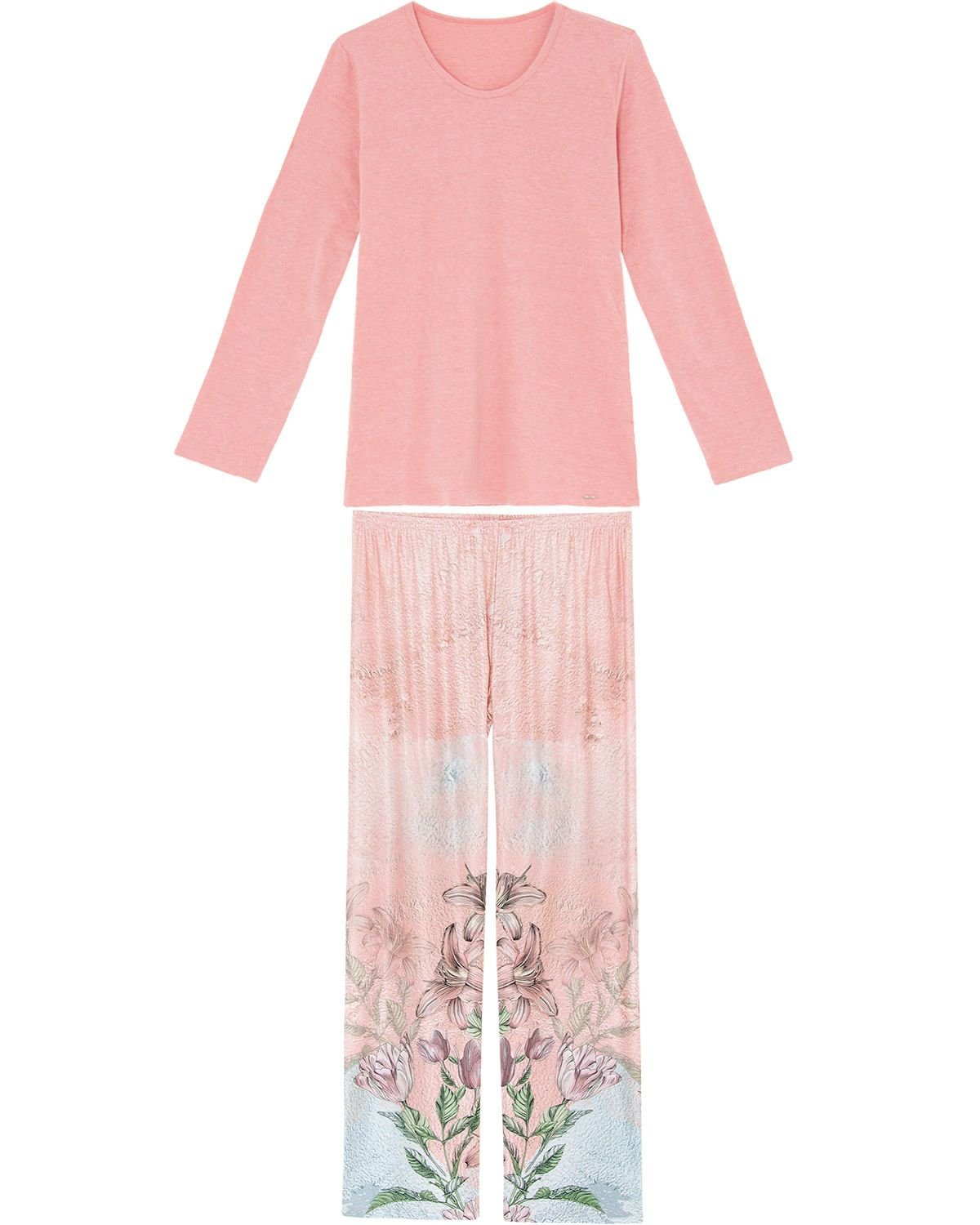 Um toque suave acompanhado de um visual despojado nesse lindo pijama que é a cara do inverno, que junto com a estampa floral formam a combinação perfeita para noites tranquilas. A blusa de manga longa em malha plume e a calça em cetim flanelado, formam um conjunto delicado, acompanahndo a tendência floral.