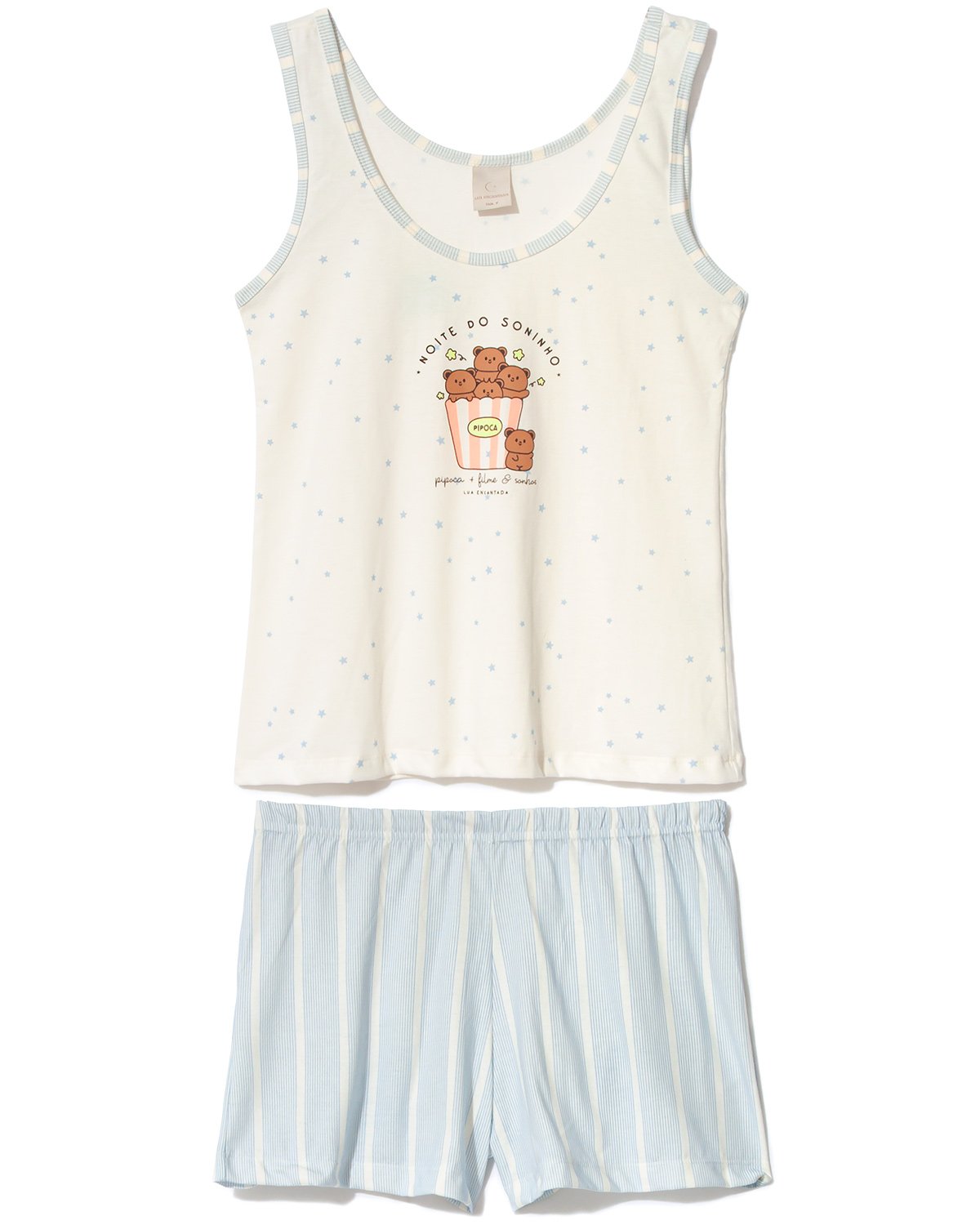 O conjunto traz um acabamento especial na gola da blusa, valorizando a peça, além da delicada estampa de listras e estrelas. O short possui elástico no cós costurado junto ao tecido para garantir mais conforto.