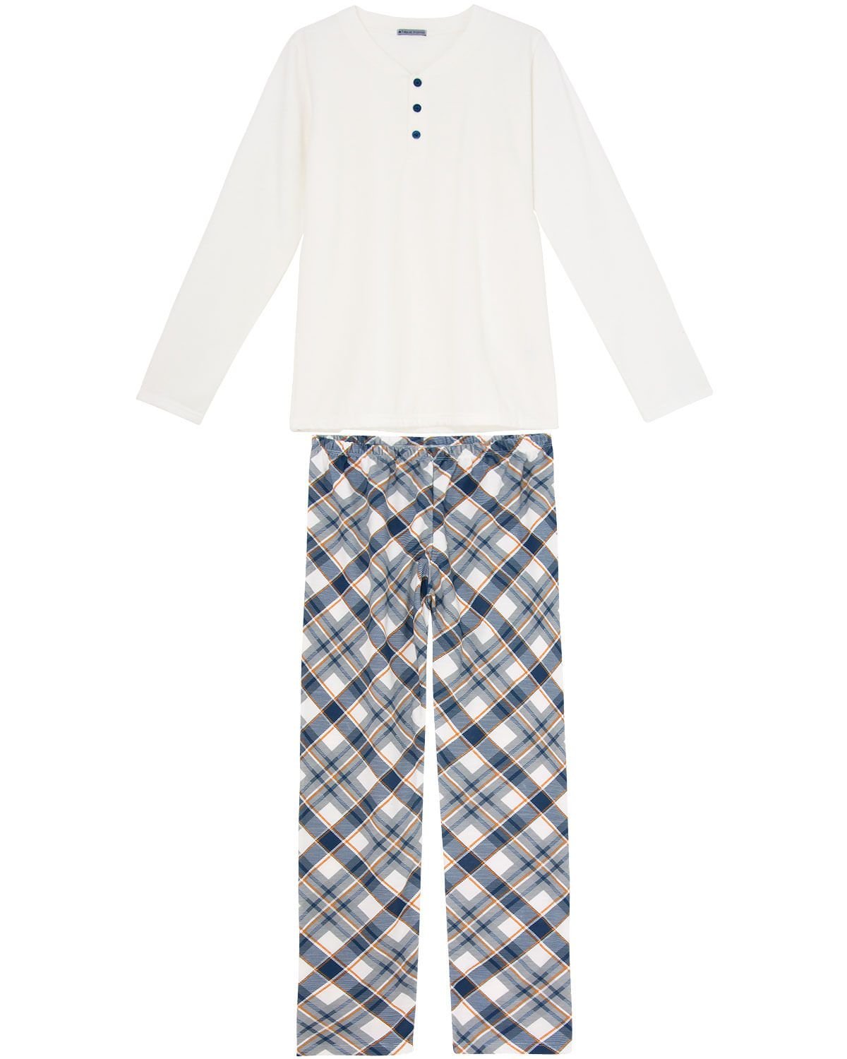O inverno pede o aconchego desse pijama, todo confeccionado em moletinho flanelado. Sua blusa lisa, possui gola com elasticidade e botões na parte frontal, também é composto por uma linda calça xadrez clássica da estação, trazendo elástico no cós.