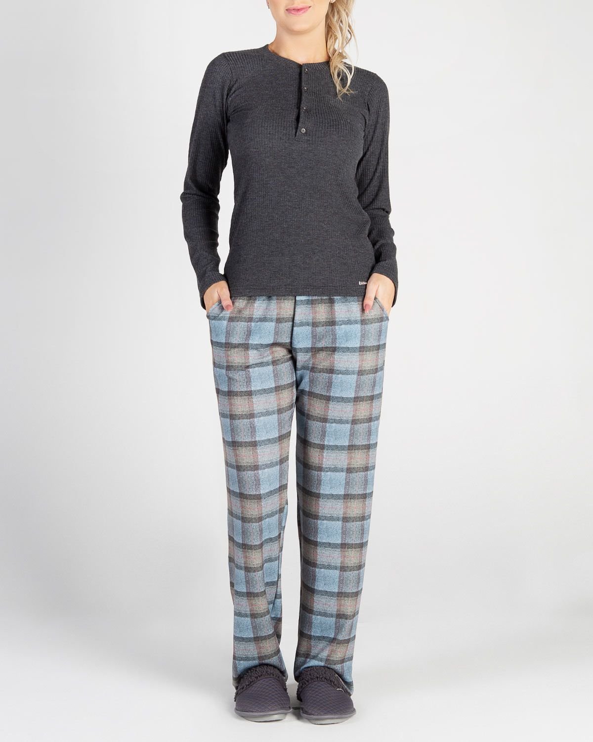 Este pijama clássico para as noites de inverno possui blusa com semi abertura e é confeccionada em tecido canelado com elastano, o que dá proporciona muito conforto. A calça em poliplex, tecido encorpado e com toque extremamente macio, possui bolsos laterais e linda estampa xadrez. Modelo disponível também no masculino e no infantil, ótima opção para compor o look "Família igual".