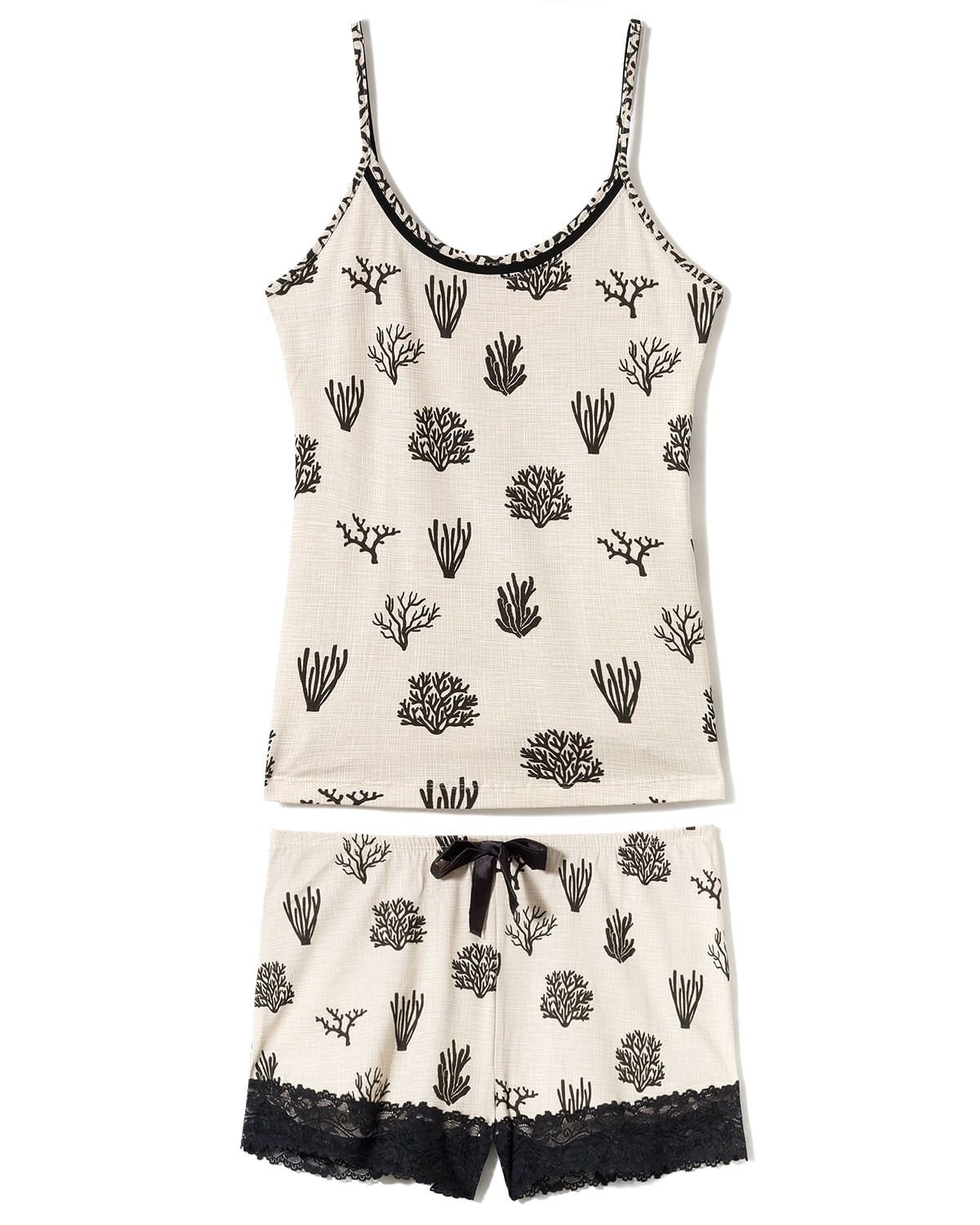 O conjunto exibe estampa de corais, com um padrão único criado especialmente para o acabamento da gola com viés duplo. O short tem laço em cetim e renda no barrado, refletindo toda a essência da feminilidade.