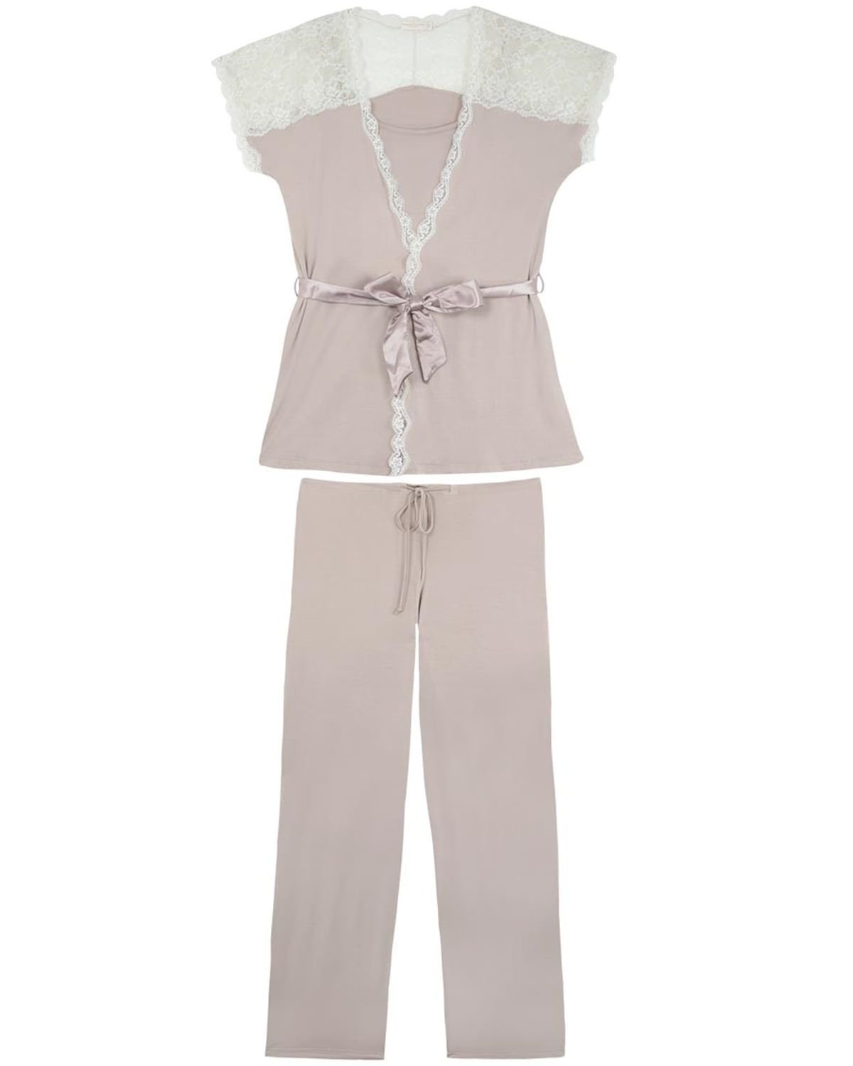 O pijama é aquela peça graciosa, com uma modelagem pratica, moderna e feminina, trazendo conforto e beleza para suas primeiras noites de mamãe. Feita em viscose ultra macia, com fino acabamento em renda e fita de cetim que transpassa na blusa, e alças removíveis na regata que vai por baixo, facilitando a amamentação. Essa peça é a opção ideal para atender as necessidades de pós cirurgia e amamentação. Destaque para cordão de amarrar na calça.