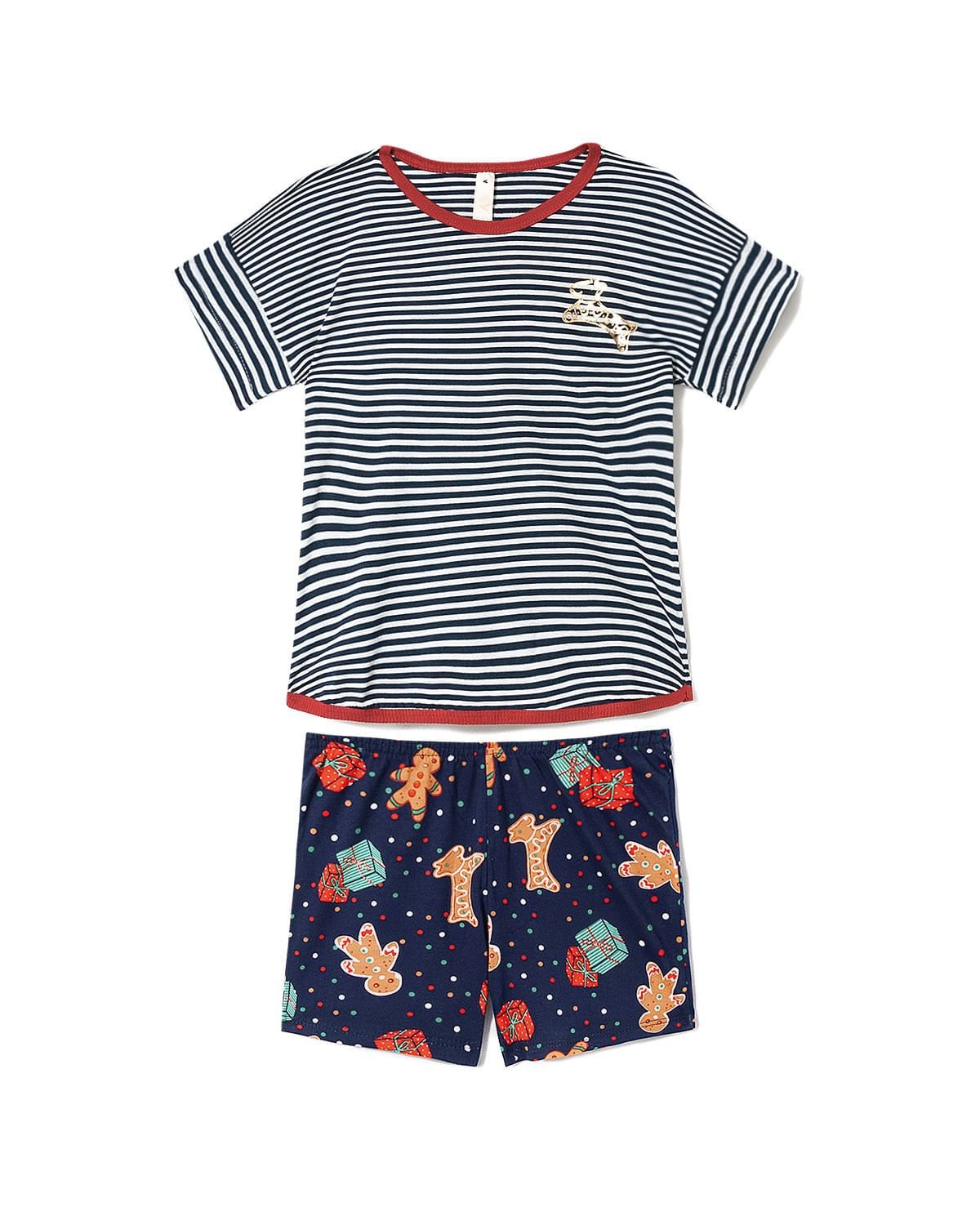 Este pijama infantil feminino é confeccionado em Algodão, que além de seu toque extremamente macio, esta malha passa por um tratamento que beneficia não só o tecido, mas quem o usa, pois oferece maior conforto e evita irritações na pele. Ele traz blusa com padronagem de listras e short com estampa natalina super colorida.