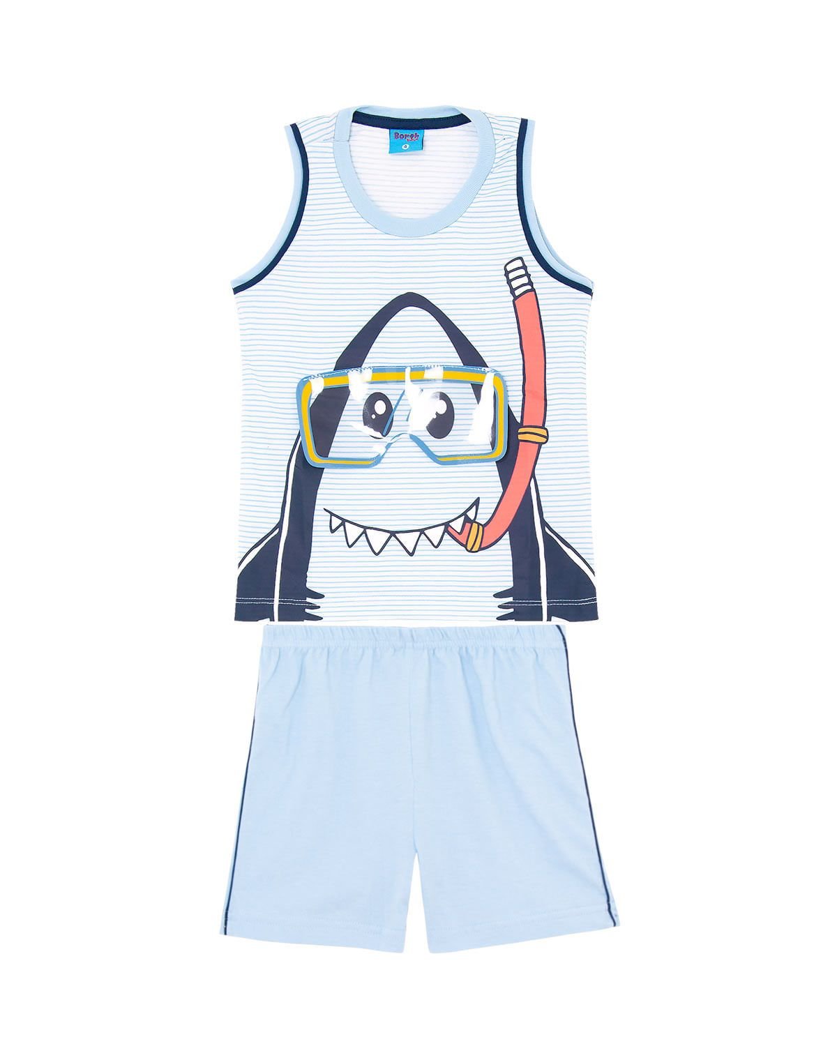 O maior predador dos oceanos veio para divertir e alegrar as noites dos meninos! Todo confeccionado em malha 100% algodão, é composto por regata listrada com estampa frontal de tubarão, e detalhe em máscara de mergulho 3D. Seu short possui viés lateral na cor azul marinho, e cós com elástico para melhor caimento no corpo.