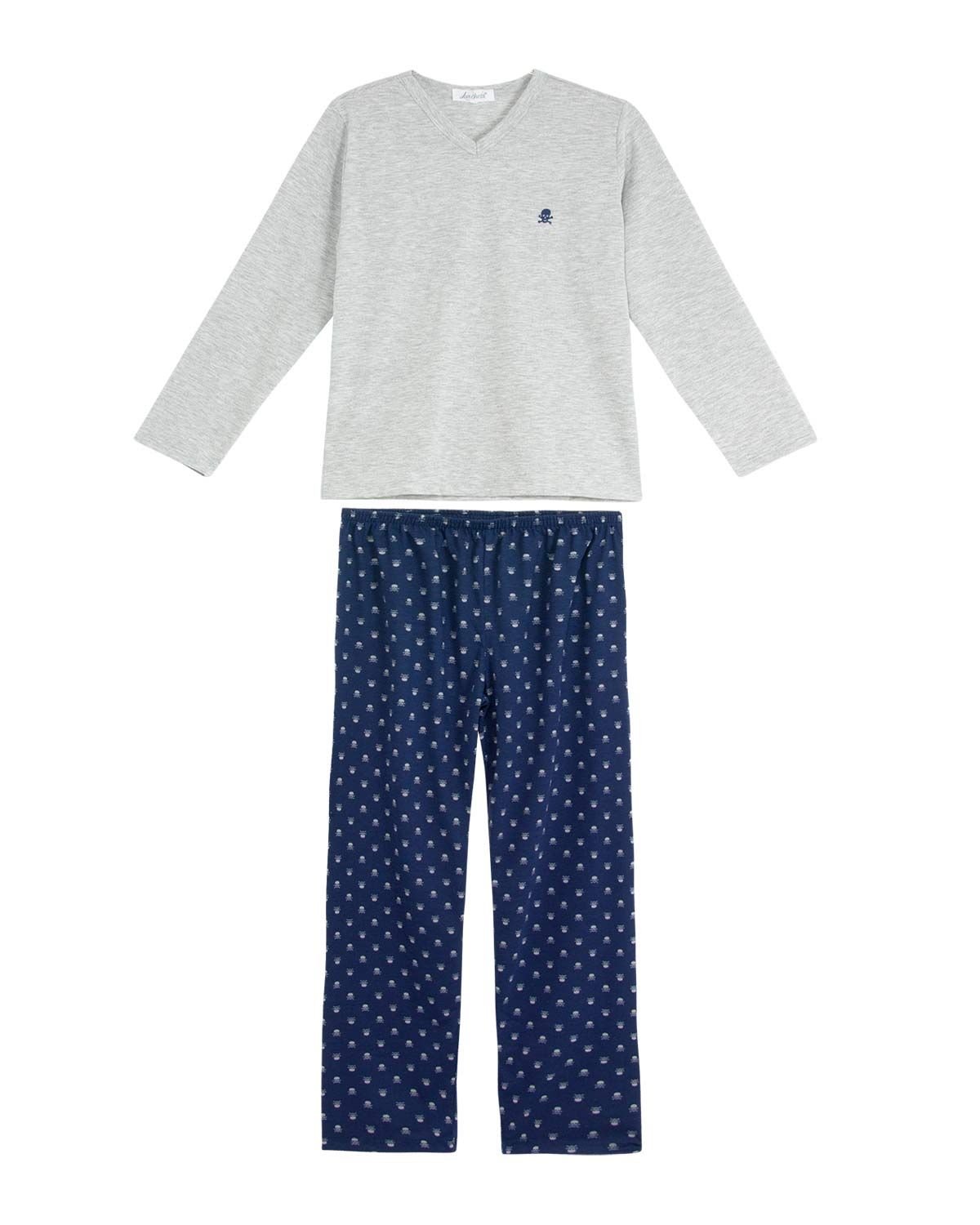 Para as crianças, não existe nada melhor do que estampas divertidas e criativas. E na hora de dormir, isso não é diferente. Para noites muito agradáveis em família, esse pijama possui estampa super moderna e jovem de caveiras por toda a calça, acompanhada de camiseta manga longa completando o visual jovem para o menino moço. Todo em malha 100% algodão de alta qualidade, garantindo o conforto e a durabilidade da peça.