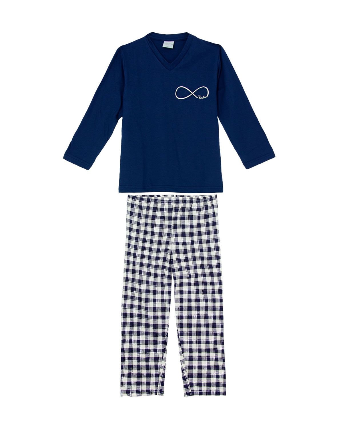 Esse pijama infantil masculino é a peça ideal para deixar os momentos em família divertido e inesquecível. A blusa de manga longa possui o símbolo do infinito com a plavara Família, e a calça em malha xadrez faz um composê mais hamonioso e encantador. Confeccionado em malha de algodão, leve e macia, tecido que proporciona noites tranquilas e confortáveis. Destaque para amarração no cós.
