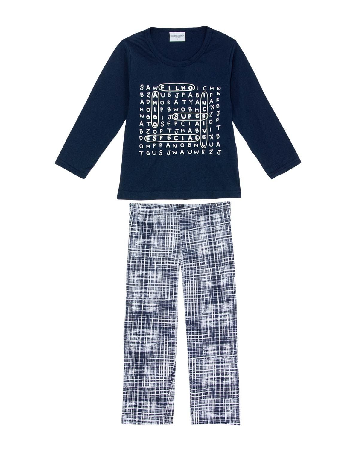 A hora de dormir é um momento único em família e precisa ser divertido, colorido e muito acolhedor. Para isso, pijamas lúdicos em modelos que respeitam a infância são essenciais, como este modelo longo todo em algodão, com estampa de caça palavras na camiseta manga longa, acompanhada de calça comprida com estampa diferenciada. Modelo disponível no adulto, possibilitando um visual "tal pai, tal filho" para momentos únicos em família.