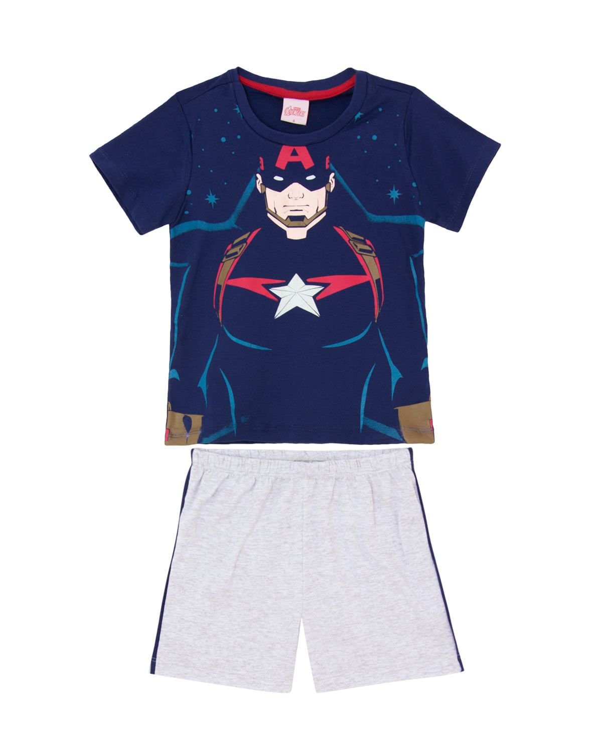 O super-herói dos quadrinhos americanos veio para salvar e divertir as noites de sono dos meninos. Todo confeccionado em malha 100% algodão, esse pijama traz blusa manga curta com estampa que brilha no escuro, e short em malha mescla com viés azul na lateral.