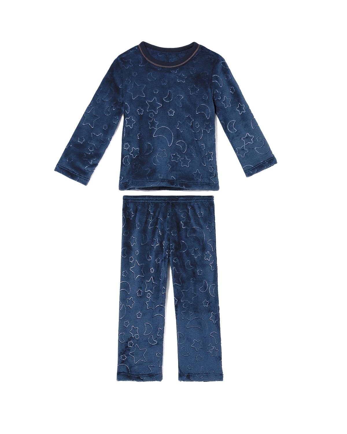 As crianças irão amar este lindo pijama confeccionado em soft fleece, tecido de toque extremamente macio que possui aspecto felpudo no lado interno e externo. Sua tecnologia cria espaços entre os pelos, formando bolsas de ar, o qual se aquece ao toque do corpo. Esse modelo unissex é composto por blusa com costura aparente em tom contrastante na gola, e calça com cós de elástico, o que permite ajuste perfeito no corpo. A diversão e fofura ficam por conta da estampa em textura de estrelas e luas, dado pelo processo de queima da fibra, o que destaca ainda mais o desenho.
