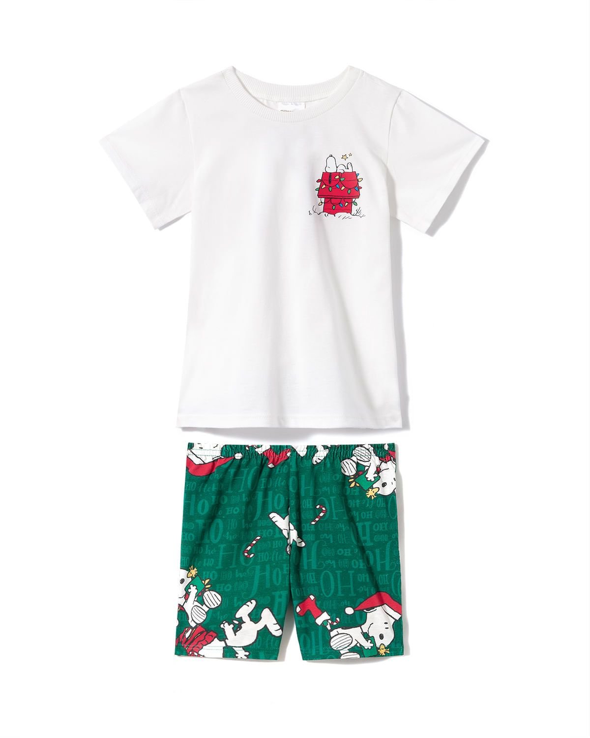 A blusa com gola redonda exibe uma estampa localizada, enquanto o short esbanja fofura com a estamparia do Snoopy em clima natalino.