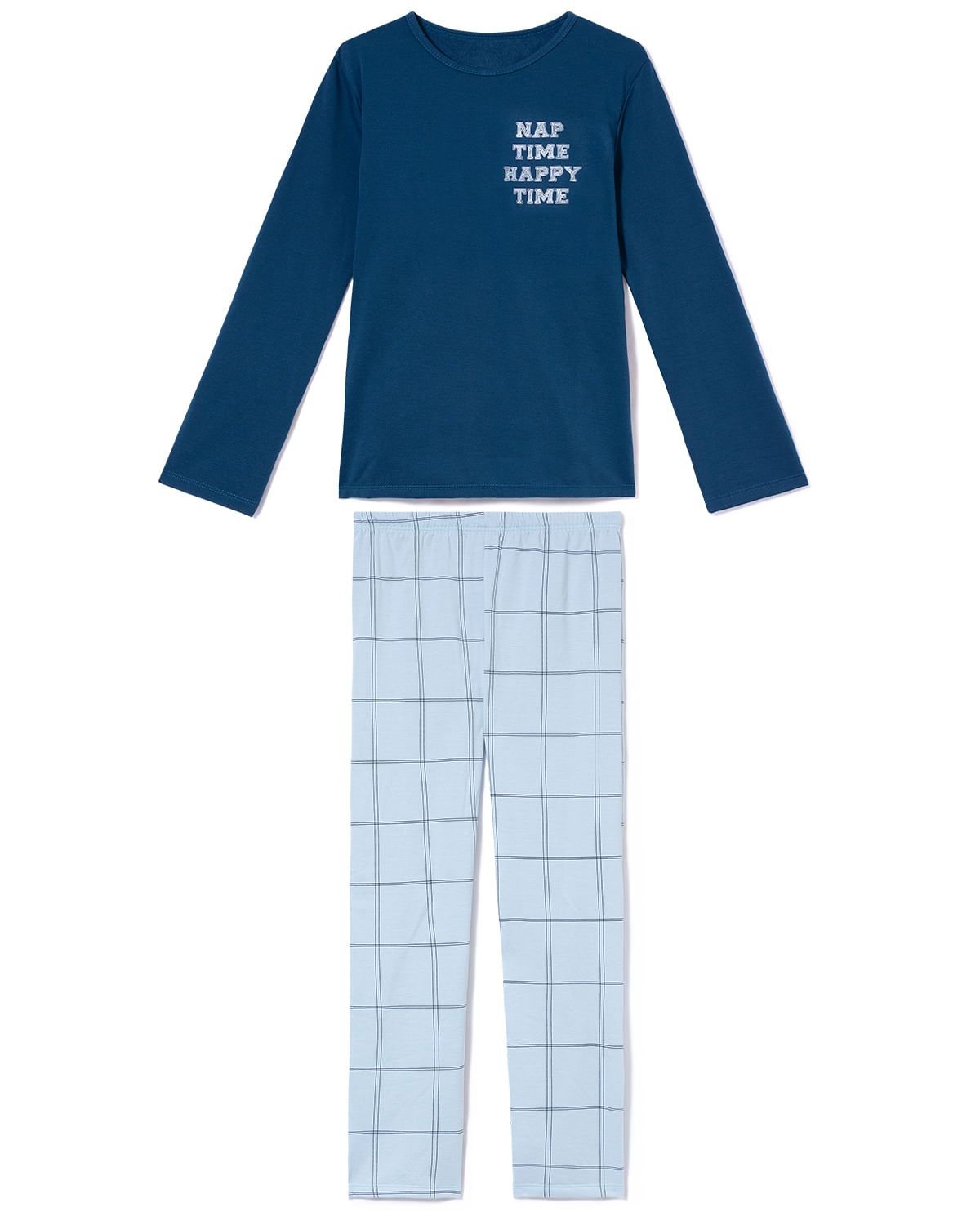 Com este pijama os momentos de descanso serão ainda melhores. Confeccionado em Moletinho Flanelado, tecido de toque macio e que oferece sensação térmica apropiada para os dias mais frios. Este modelo masculino é composto por blusa de mangas longas com silk localizado com a frase "Nap Time, Happy Time" que traduzido "Hora da soneca, hora feliz". Já a calça com cós de elástico traz padronagem atemporal.