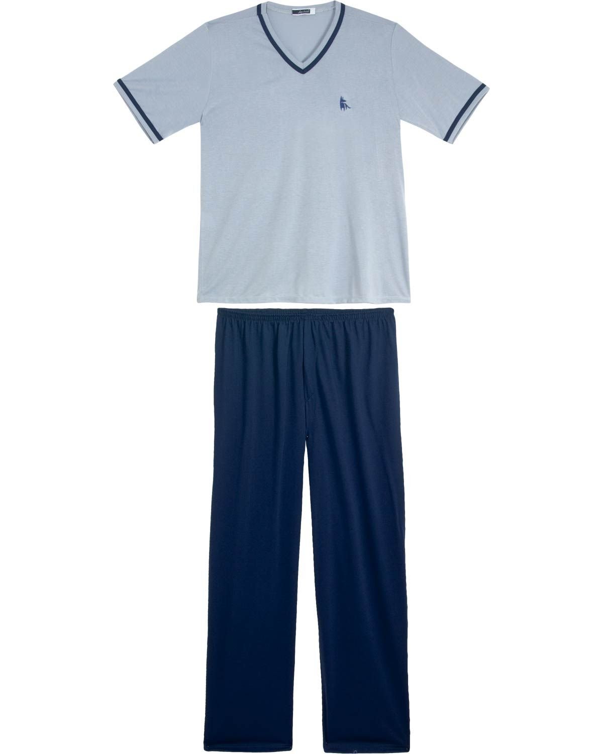 Ao escolher um pijama para uma ótima noite de sono e descanso, é preciso priorizar o conforto e a praticidade que ele oferece. Esse modelo possui camiseta mescla com decote em "V" e calça comprida azul, garantindo um visual clean, perfeito para homens clássicos. O conforto é proporcionado pela malha de excelente qualidade confeccionada em algodão 100%, ideal para noites em que o verão toma conta, pois não esquenta e garante o frescor da pele a noite inteira.