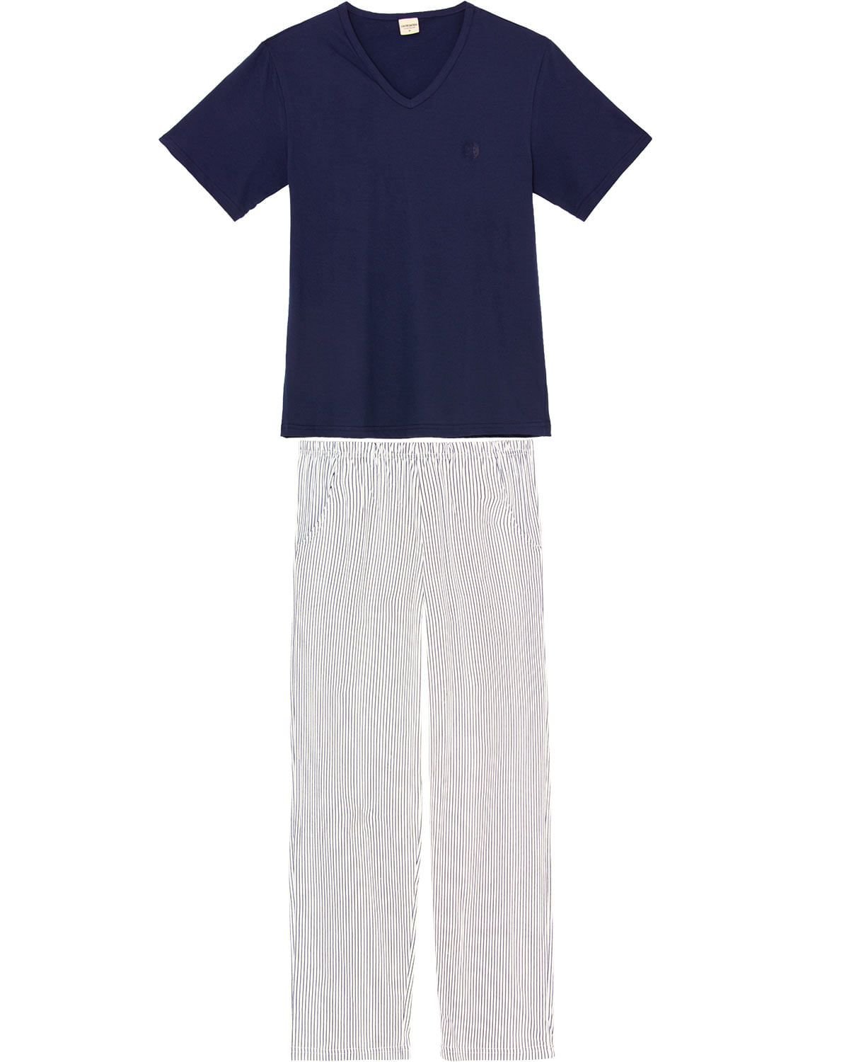 Esse pijama é aquela peça que não pode faltar no guarda-roupa do homem que preza pelo conforto e estilo nos momentos mais "relax". Esse conjunto, todo em algodão penteado, possui blusa de manga curta com decote "V", e calça com listras e bolsos laterais, ideal para os homens que valorizam os momentos de descanso.