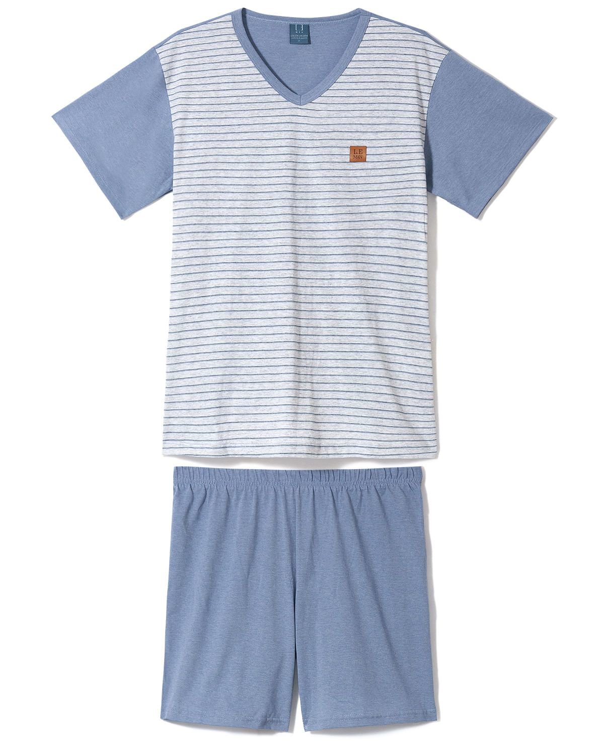 Com um design clássico, este pijama masculino é sempre uma excelente opção para qualquer homem. A blusa mescla de manga curta apresenta a parte frontal com listras, enquanto as costas e mangas são lisas. O short, no mesmo tom suave de azul da blusa, proporciona uma harmonia perfeita ao pijama. A peça é caracterizada pelo seu conforto e leveza, graças à composição em malha de algodão, assegurando todo o conforto que procuramos em um pijama.