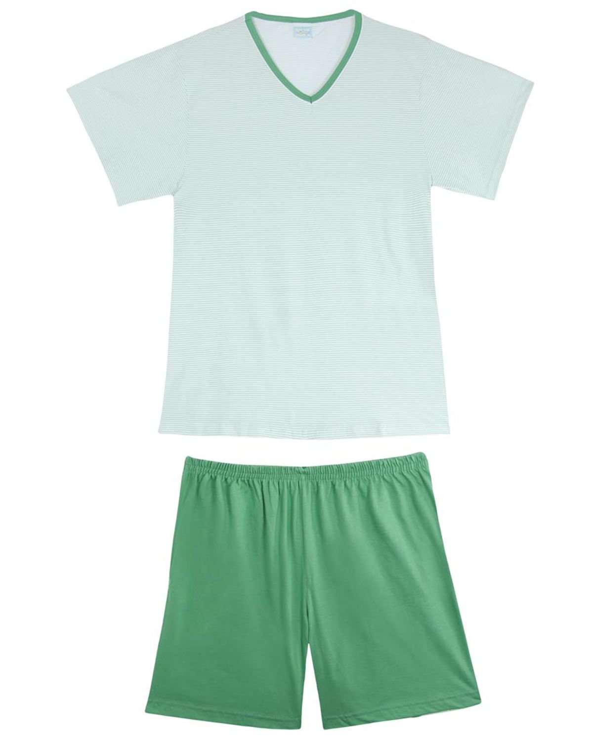 O pijama masculino é aquele básico necessário, com um charmoso decote em 'V', malha extremamente macia e moderna