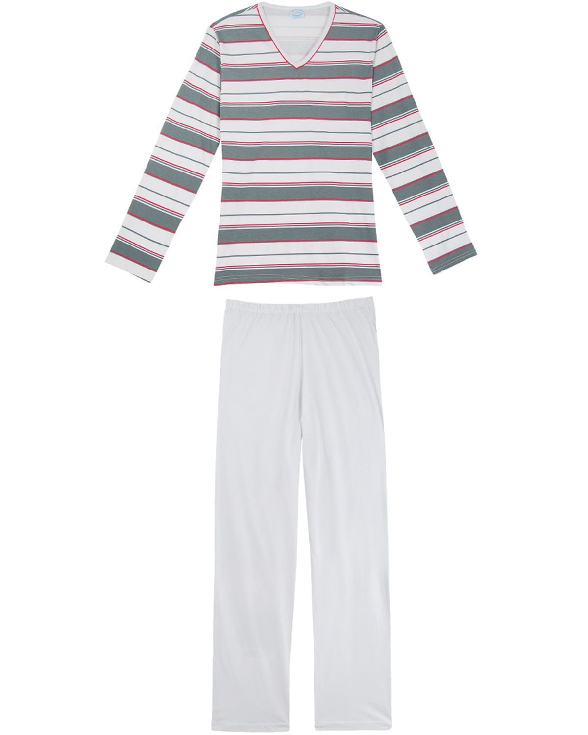 Este pijama combina a beleza das listras e faixas com o conforto do algodão garantindo uma maior liberdade de movimentos, numa modelagem básica com decote em 'V' e calça lisa. É a peça ideal para noites aconchegantes de temperatura amena.