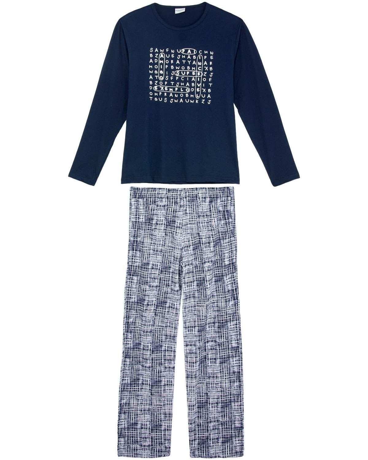 Homens de personalidade e que não abrem mão do conforto não dispensam um pijama para o momento de relax. E e sse modelo, todo confeccionado em algodão da melhor qualidade, proporciona um toque leve e macio na pele, além de garantir uma ótima durabilidade. Com camiseta manga longa com estampa de caça palavras, acompanhada de calça com estampa moderna, conferindo o estilo jovem da peça. Modelo disponivel no infantil, para compor um visual 'tal pai, tal filho'.