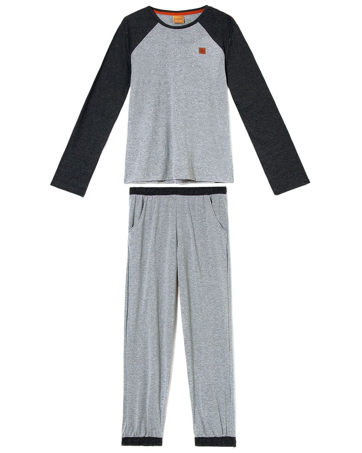 Para os momentos de descanso dos homens, trouxemos este pijama confeccionado em malha mescla, tecido leve e confortável. Composto por blusa de mangas longas com recorte em tom contrastante, traz calça com elástico no cós, punhos e bolsos, tornando o modelo ainda mais funcional. Destaque para aplicação na blusa em courinho com logo da marca.