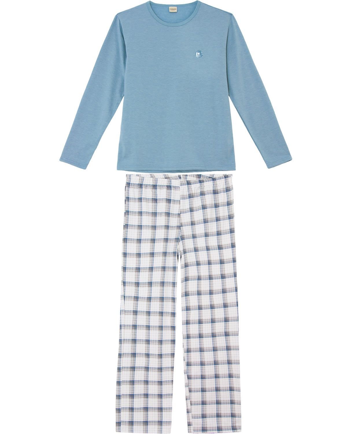 Um pijama clássico e sofisticado, tem tecido macio e é bem quentinho, ideal para noites mais frias. Possui blusa de moletinho flanelado em cor azul com aplique da coleção asculina da Lua Encantada, a calça de cós em elástico possui estampa xadrez na pegada da estação, e é soltinha para maior conforto e tranquilidade.