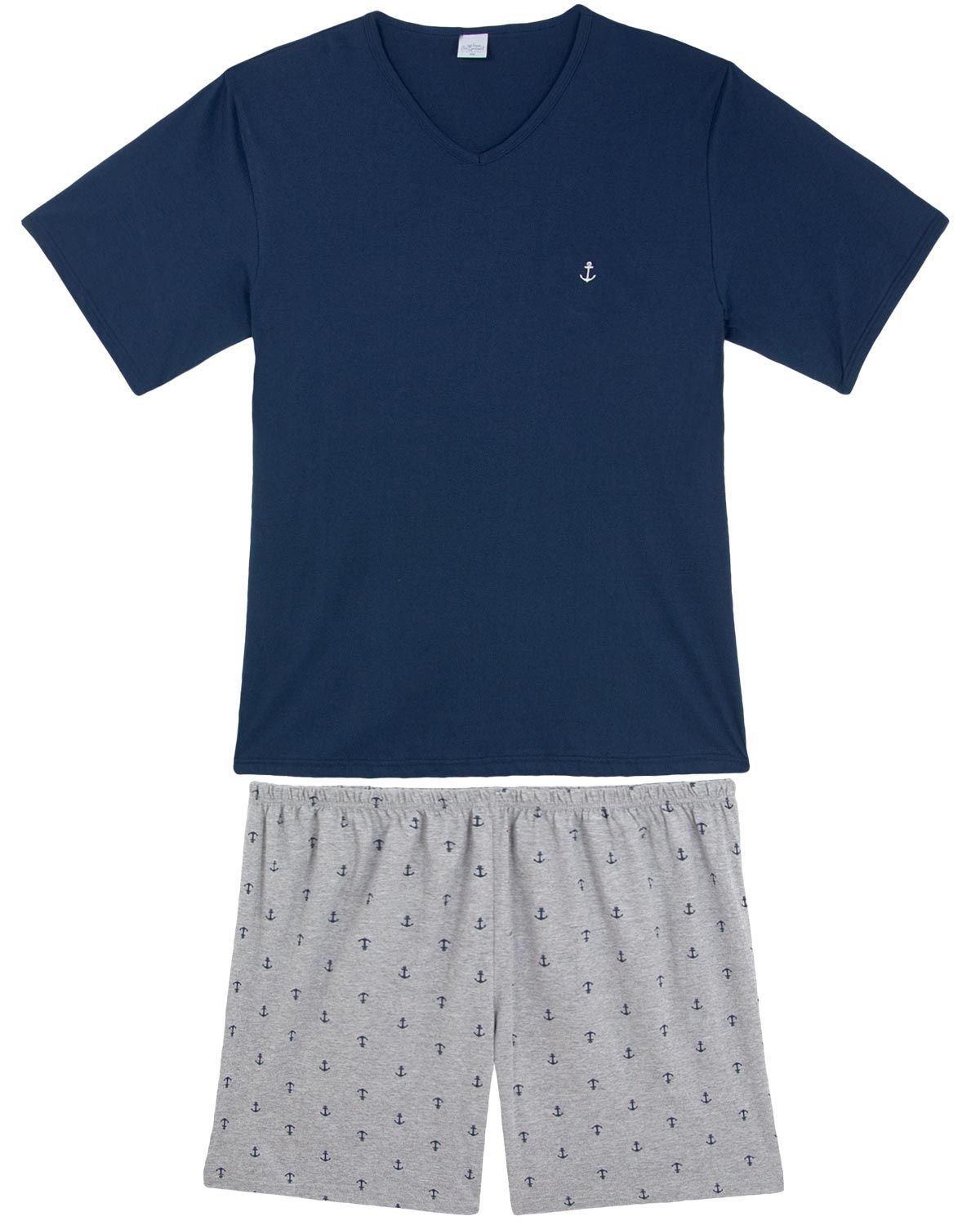 Ideal para noites tranquilas e confortáveis no verão, este modelo de pijama todo em algodão, com estampa com motivos Navy, é a peça ideal. Com camiseta manga curta lisa com decote em ‘V’ e short estampado, é o tipo de peça perfeita para homens modernos e cheios de personalidade.
