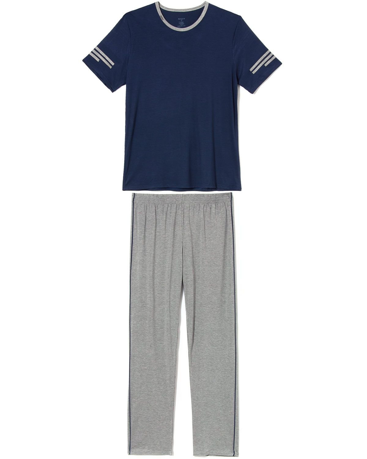 Da casa para as ruas, esse conjunto é uma alternativa fashion para o guarda-roupa masculino. Esse pijama é todo confeccionado em Visco Stretch, a viscolycra de excelente qualidade da Recco, um tecido macio, com bom caimento e maior resistência à formação de bolinhas. Possui blusa de manga curta com listras nas mangas que contrastam azul da peça, e calça com víes lateral e elástico no cós.