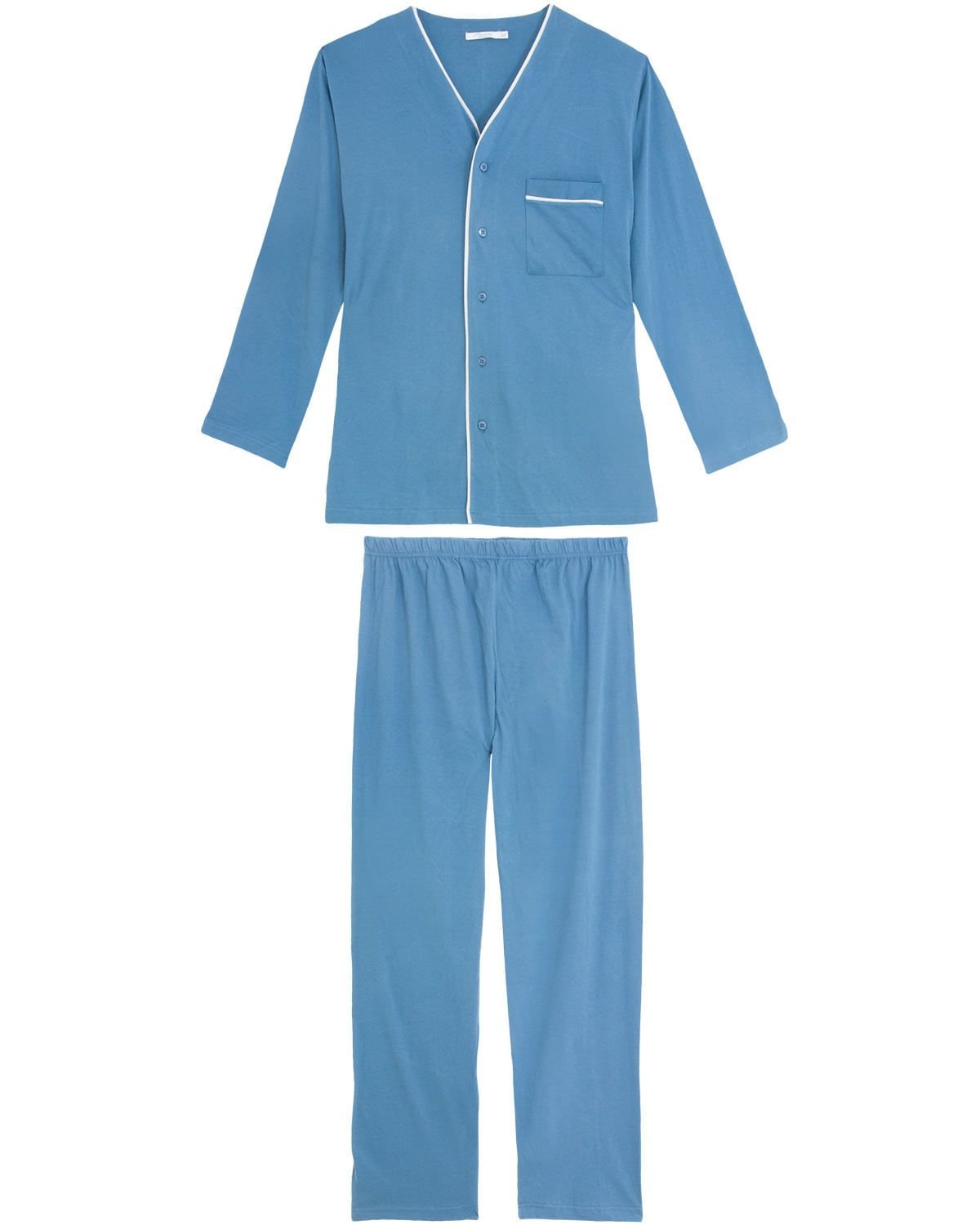 O pijama masculino é confeccionado em malha 100% algodão, modelagem mais clássica de blusa manga longa com abertura em botões e decote V. Calça lisa básica com cós elástico. Destaque para bolso na parte frontal da blusa.