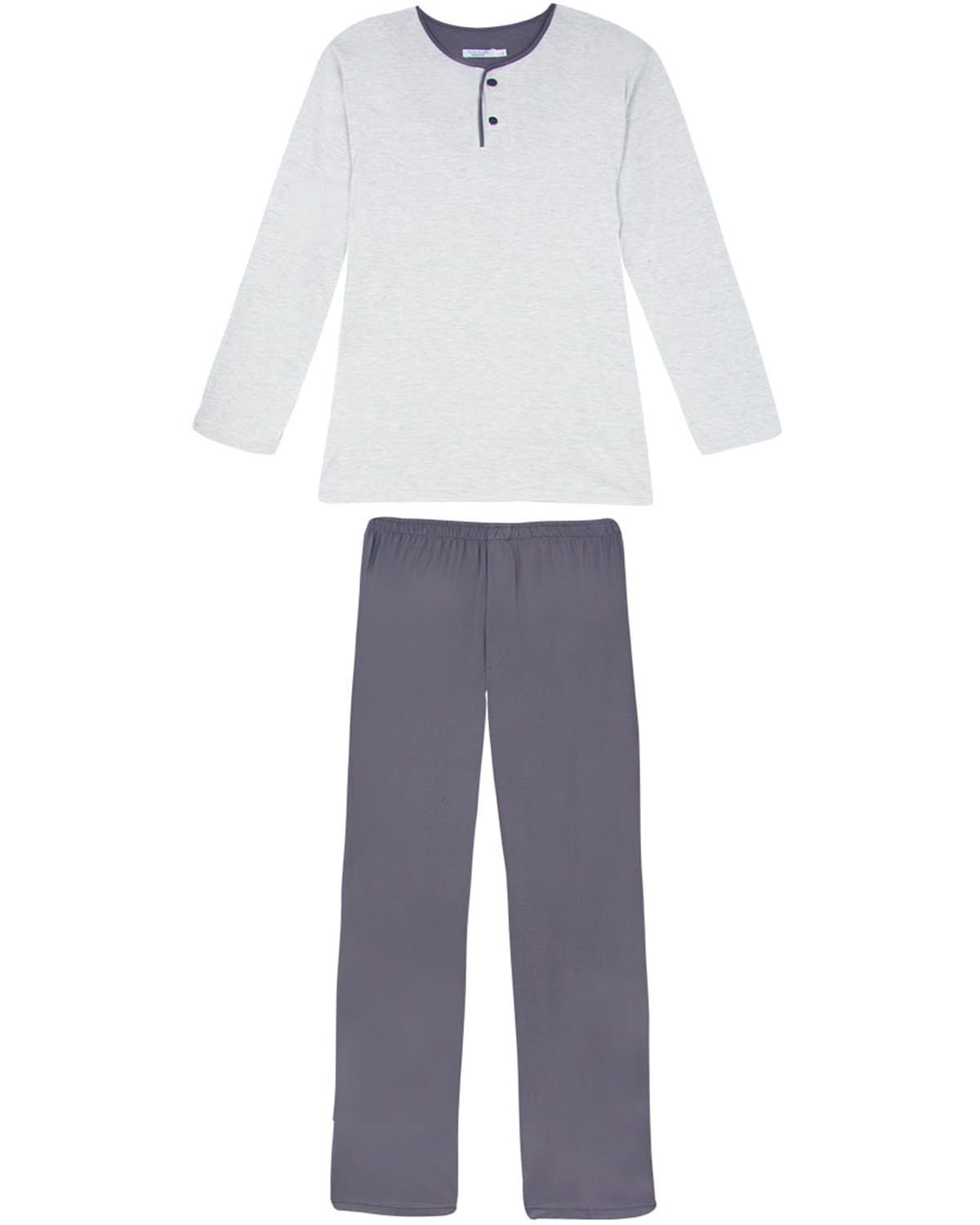 O pijama longo é o básico ideal todo confeccionado com uma malha extremamente macia. Blusa mescla cinza de manga longa com abertura de dois botões na gola canoa. Calça básica lisa com cós elástico. Destaque para acabamento em viés na gola.