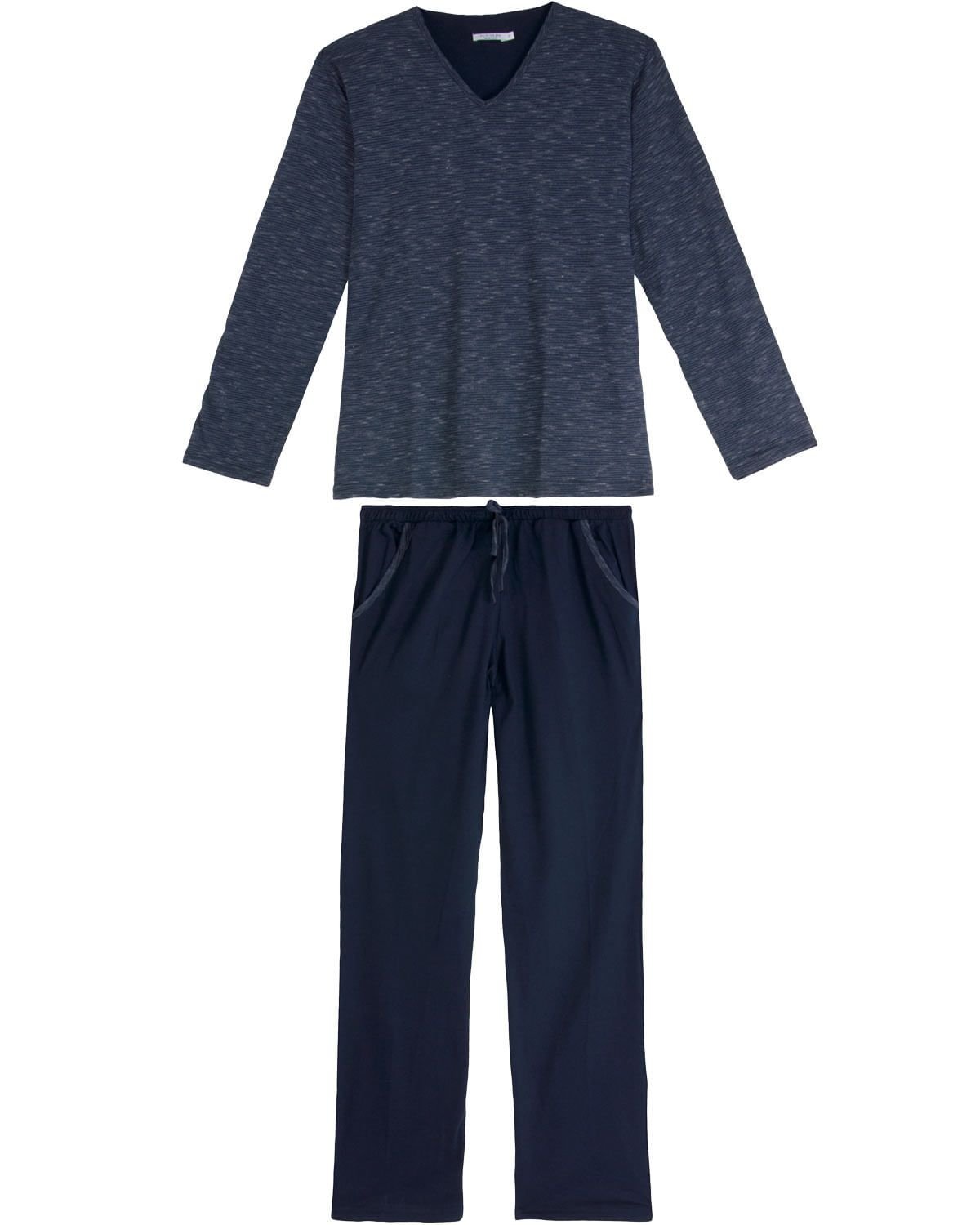 O pijama ideal para noites tranquilas e aconchegantes é aquele que proporciona conforto e estilo. Esse modelo é composto por camiseta feita de tecido devorê com listras finas mesclada de branco e gola em 'V', e calça lisa com bolsos laterais, que garantem maior praticidade e também um visual moderno e jovial para a peça.