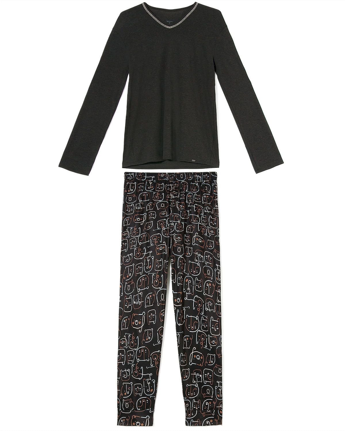 Para que as noites em família sejam ainda mais divertidas, trouxemos este pijama que une o conforto da viscolycra e o toque macio e aconchegante do comfort flanelado. Composto por blusa de mangas longas, gola V e calça com punhos, o modelo que traz estampa exclusiva da marca é ideal para os momentos de descanso. Destaque para costura aparente em tom contrastante na gola da blusa.