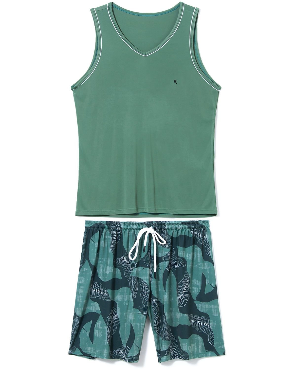 A microfibra é o tecido favorito do calor, pois é leve, tem secagem rápida e ótimo caimento no corpo. Esse pijama com toque geladinho, possui blusa regata com gola V e detalhes em viés que contrasta perfeitamente com o short que possui linda estampa de folhagens.