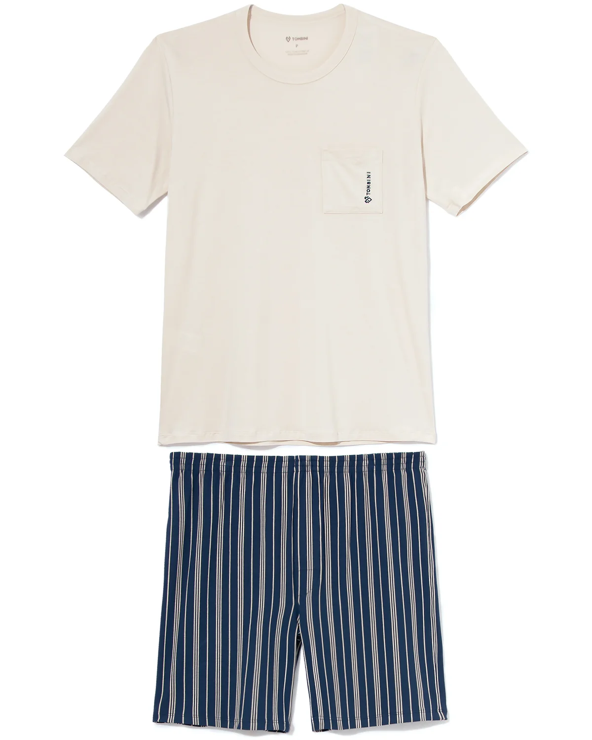 O homem ganha um visual moderno com o detalhe da gola redonda e o bolso com bordado. Enquanto o short exibe as clássicas listras verticais.