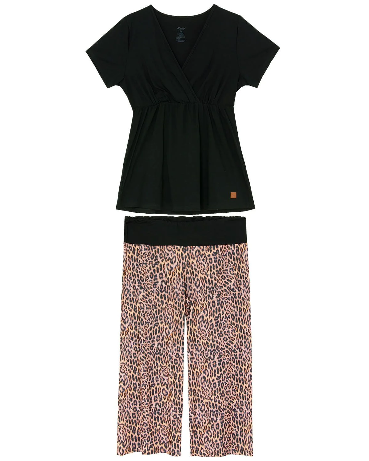 Nesse conjunto de maternidade feito em malha touch e viscose stretch, a Pijama Online uniu estilo e conforto para todas as mamães. A calça pantacourt estampada é um ícone fashion que proporciona muita liberdade e comodidade. A blusa lisa de manga curta possui um recorte abaixo do busto e decote transpassado que ajuda na hora da amamentação.