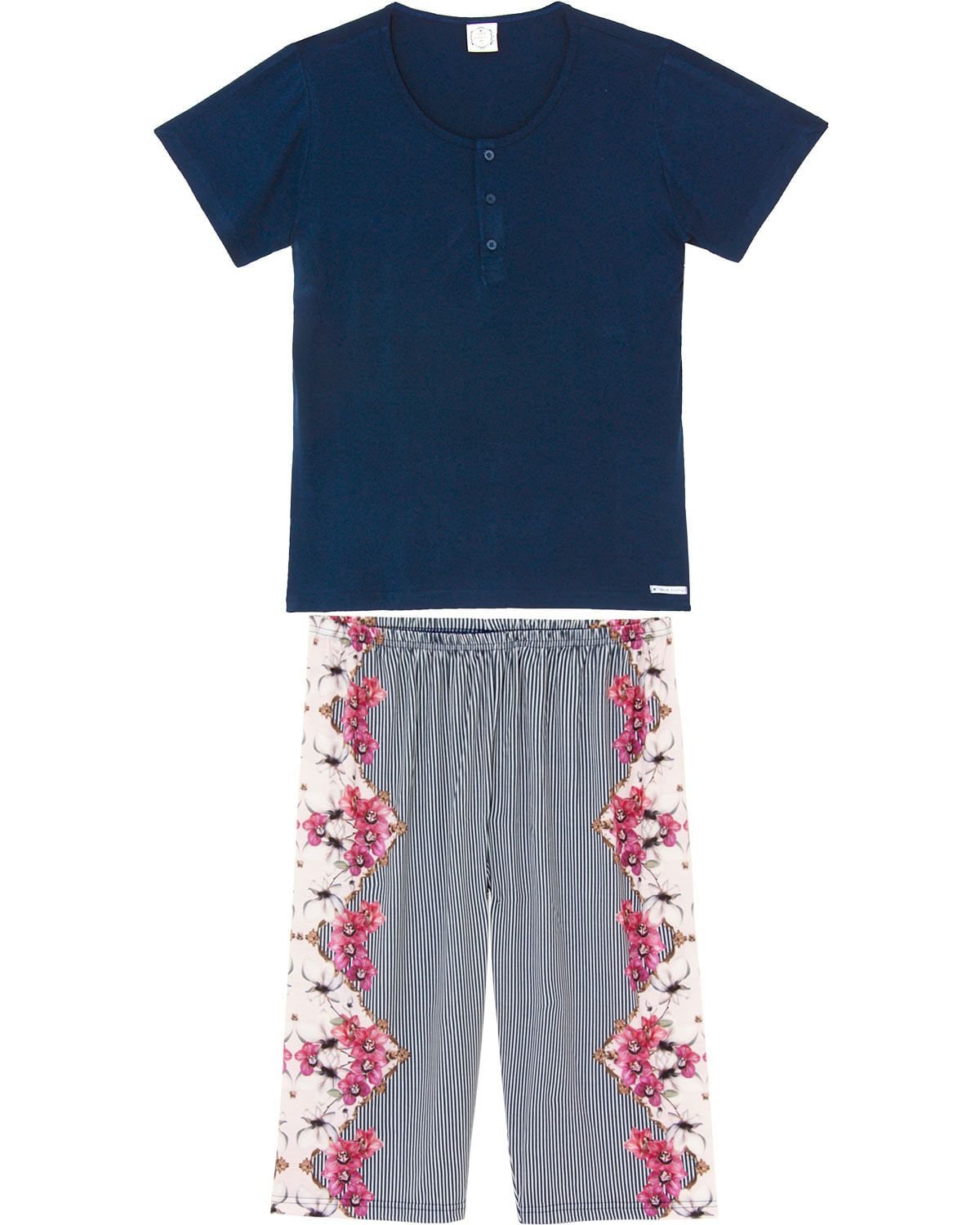Com tecido que vai bem em qualquer estação, esse pijama plus size oferece ainda mais conforto! A peça é confeccionada em viscolycra, um tecido leve e macio, perfeito para noites quentes, também é famoso por ser confortável e de fácil cuidado. O conjunto possui blusa de manga curta com abertura frontal e calça capri com estampa floral e listras.