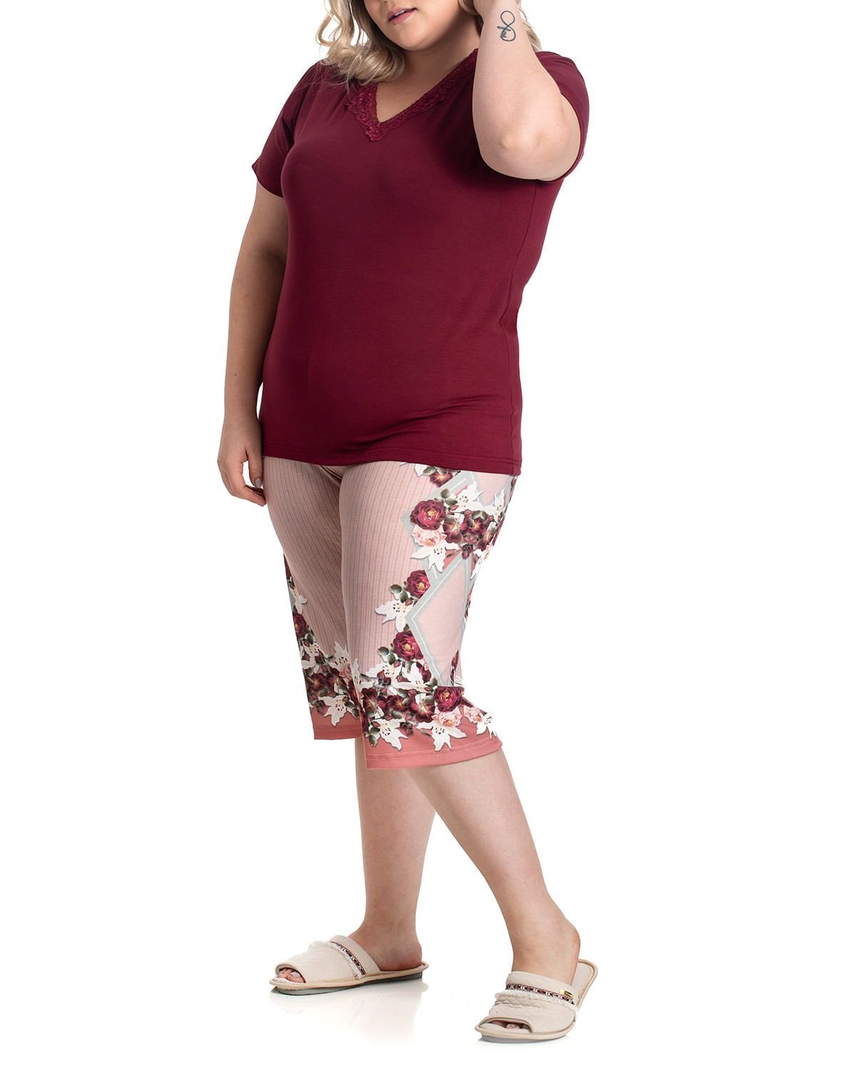 Com modelagem clássica, este pijama pescador pluz size é ideal para fazer parte do guarda roupa de uma mulher. A blusa de manga curta em viscolycra, possui renda no decote super delicada com todo tratamento para não causar irritação na pele! A calça capri em estampa floral, garante um visual harmonioso e fino para a peça.
