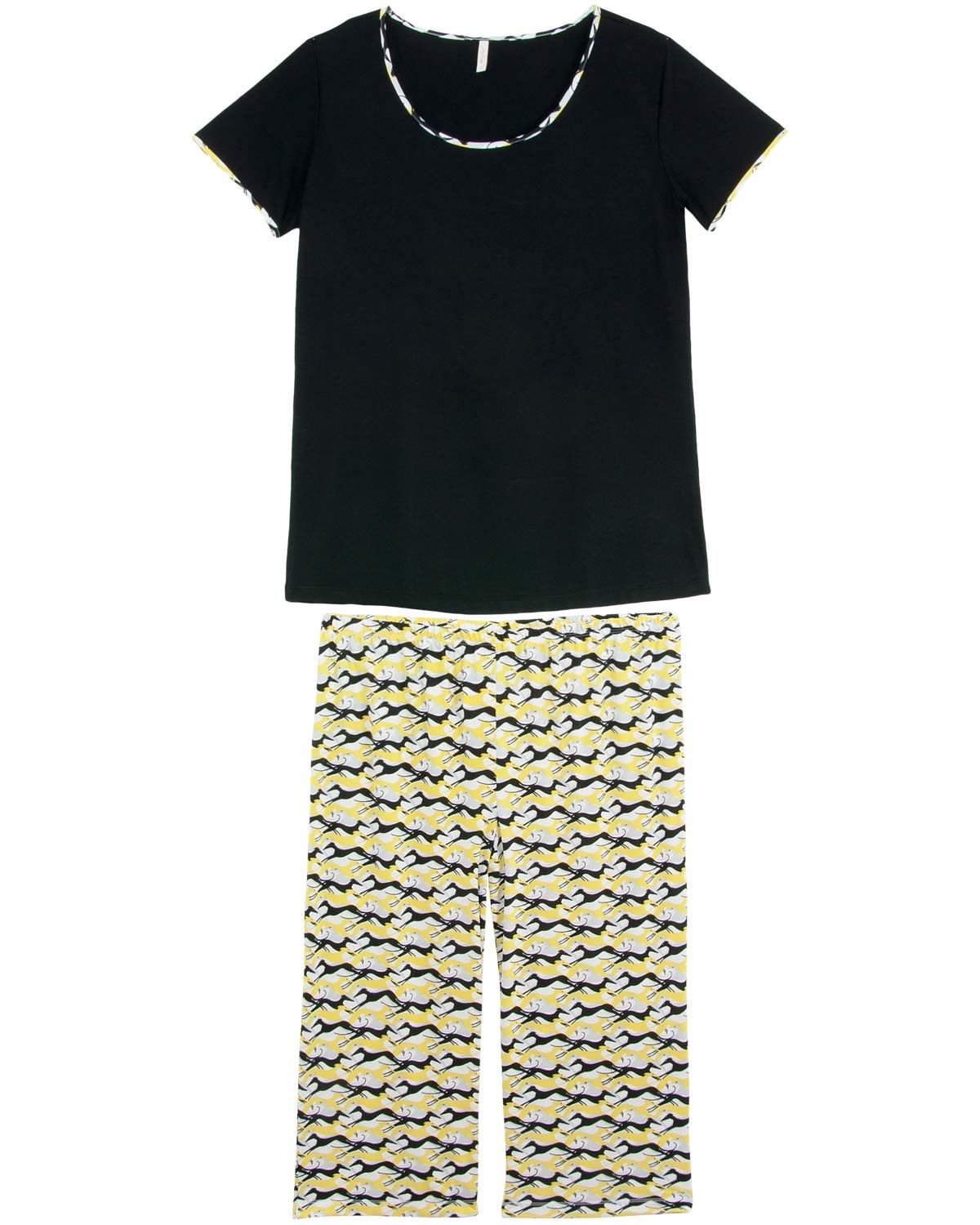 Numa composição surpreendente de tecidos, esse pijama plus size é um dos favortos quando a escolha é o conforto e praticidade. Com calça pescador toda em microfibra com graciosa estampa de galgos, acompanhada de camiseta manga curta toda em viscolycra de excelente qualidade, garantindo total mobilidade, maciez e durabilidade da peça. Pefeito pra colorir o cotidiano de grandes mulheres com muita feminilidade.