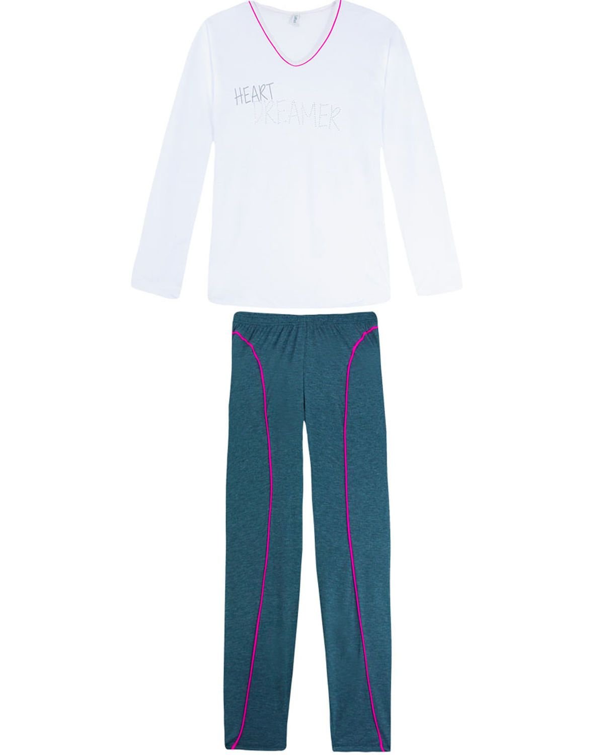 Este pijama é ideal para escolhas delicadas e femininas. Blusa em 100% Algodão, com aplicacões de pequenas pedras, e calça estilo legging, super confortável. É a peça ideal para noites de temperaturas mais amenas e aconchegantes.