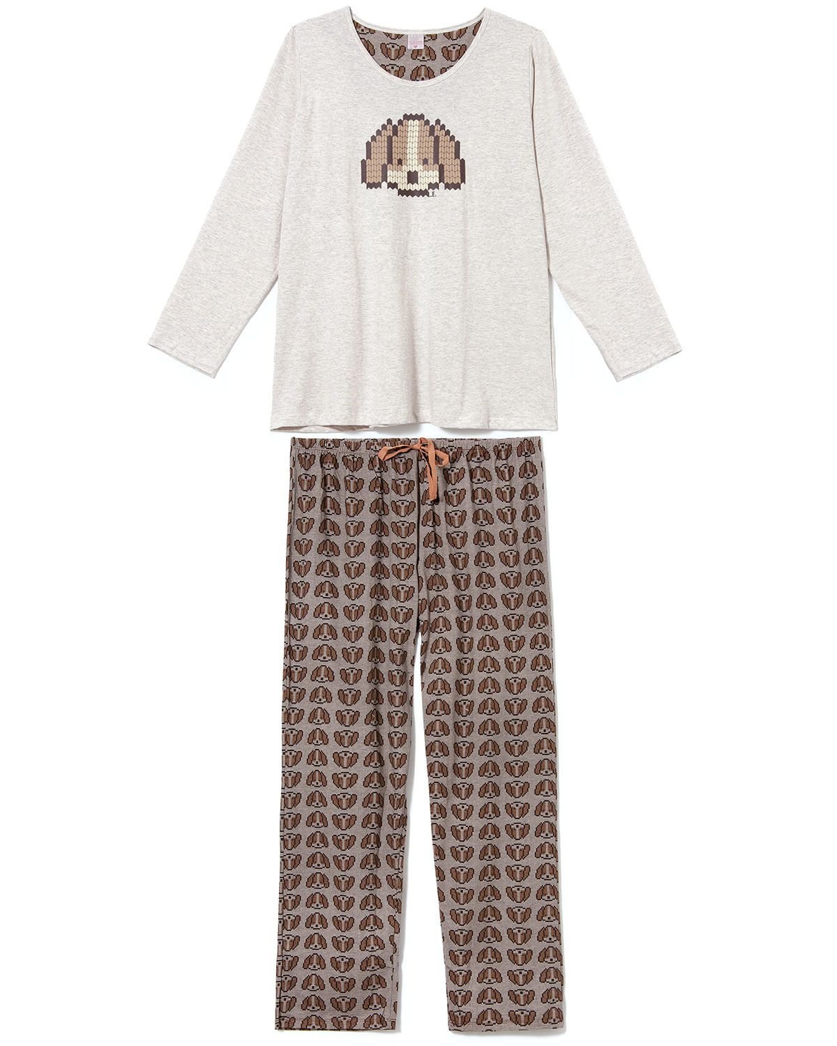 Esse pijama plus size é perfeito para quem não abre mão do conforto na hora de dormir. Possui blusa com estampa de cachorro e calça com mesma estamparia imitando pixels, garantindo um look lindo e confortável durante o dia inteiro. O conjunto é todo confeccionado em algodão, malha que proporciona conforto e leveza.