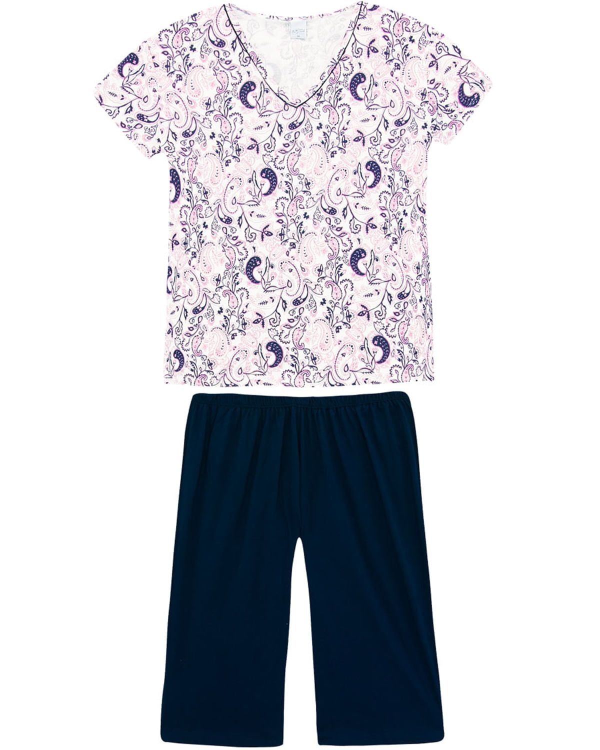 Este pijama traz conforto e modernidade para suas noites de sono.Confeccionado em 100% algodão, com calça estilo pescador e blusa meia manga com moderna e feminina estampa de arabescos, esta peça torna-se ideal para noites de temperaturas mais amenas.
