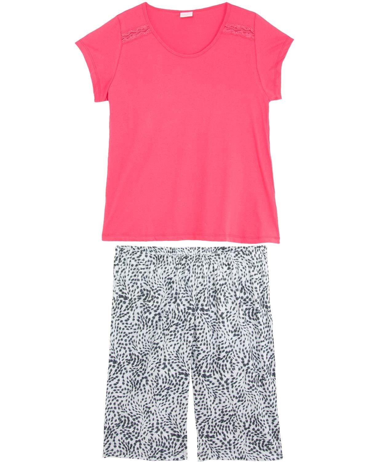 Em tamanho especial, este pijama é deal para escolhas delicadas e femininas. Todo feito em 100% algodão extremamente macio, com calça pescador estampada de oncinha e blusa manga curta com detalhe de renda nos ombros, dando o toque feminino e exclusivo a peça.