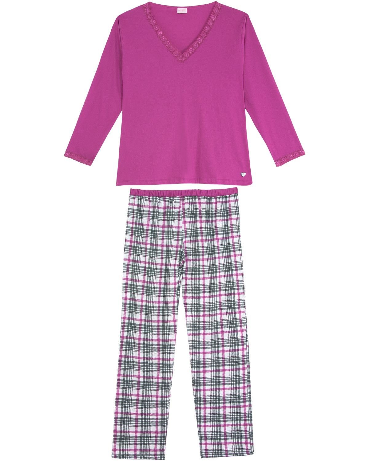 Até mesmo na hora de dormir, vestir-se bem é fundamental. Esse pijama plus size é perfeito para se sentir confortável e leve a noite inteira! Possui camiseta cor de rosa lisa, com detalhes em renda e decote em "V" e calça com moderna estampada xadrez em tons de rosa, cinza e branco. Todo feito em algodão, garante um toque suave e macio na pele.