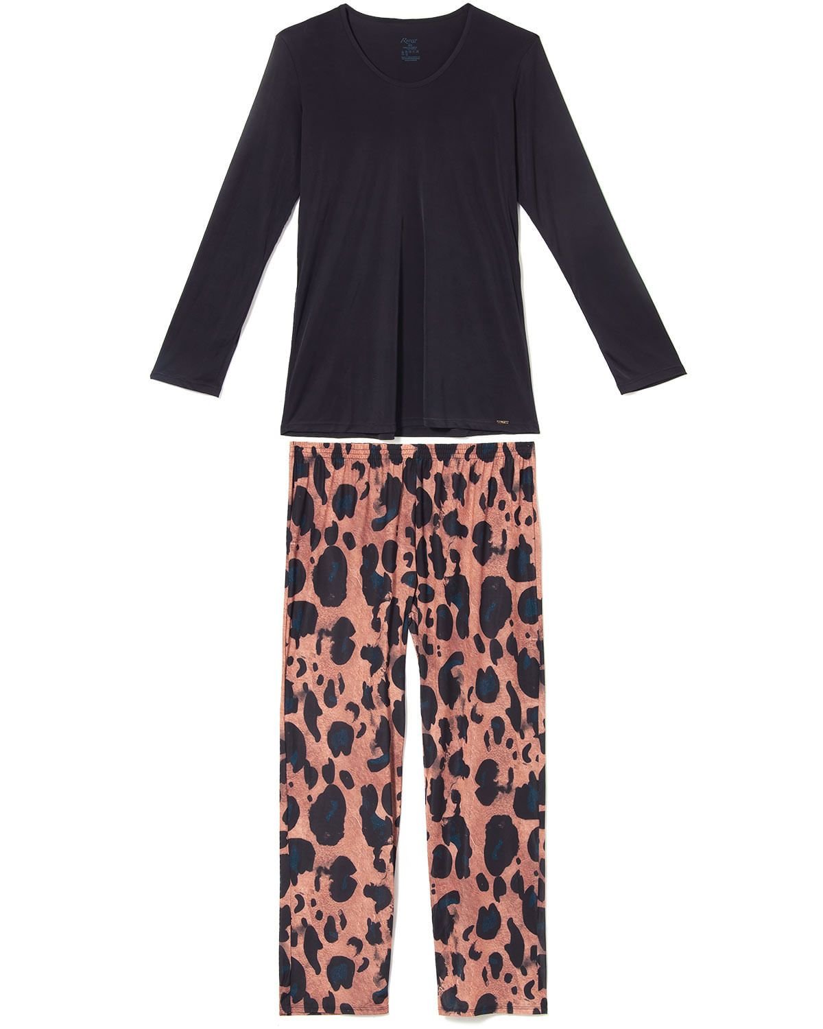 Suas noites de inverno terão muito mais conforto e estilo com esse lindo pijama. Disponível nos tamanhos extra grande, ele possui blusa manga longa e calça com estampa animal print. Um conjunto que tem a leveza, maciez e excelente durabilidade da supermicro, uma malha microfibra Amni® que traz fácil manutenção, com secagem rápida e maior vivacidade nas cores, sem risco de desbotar durante as lavagens.
