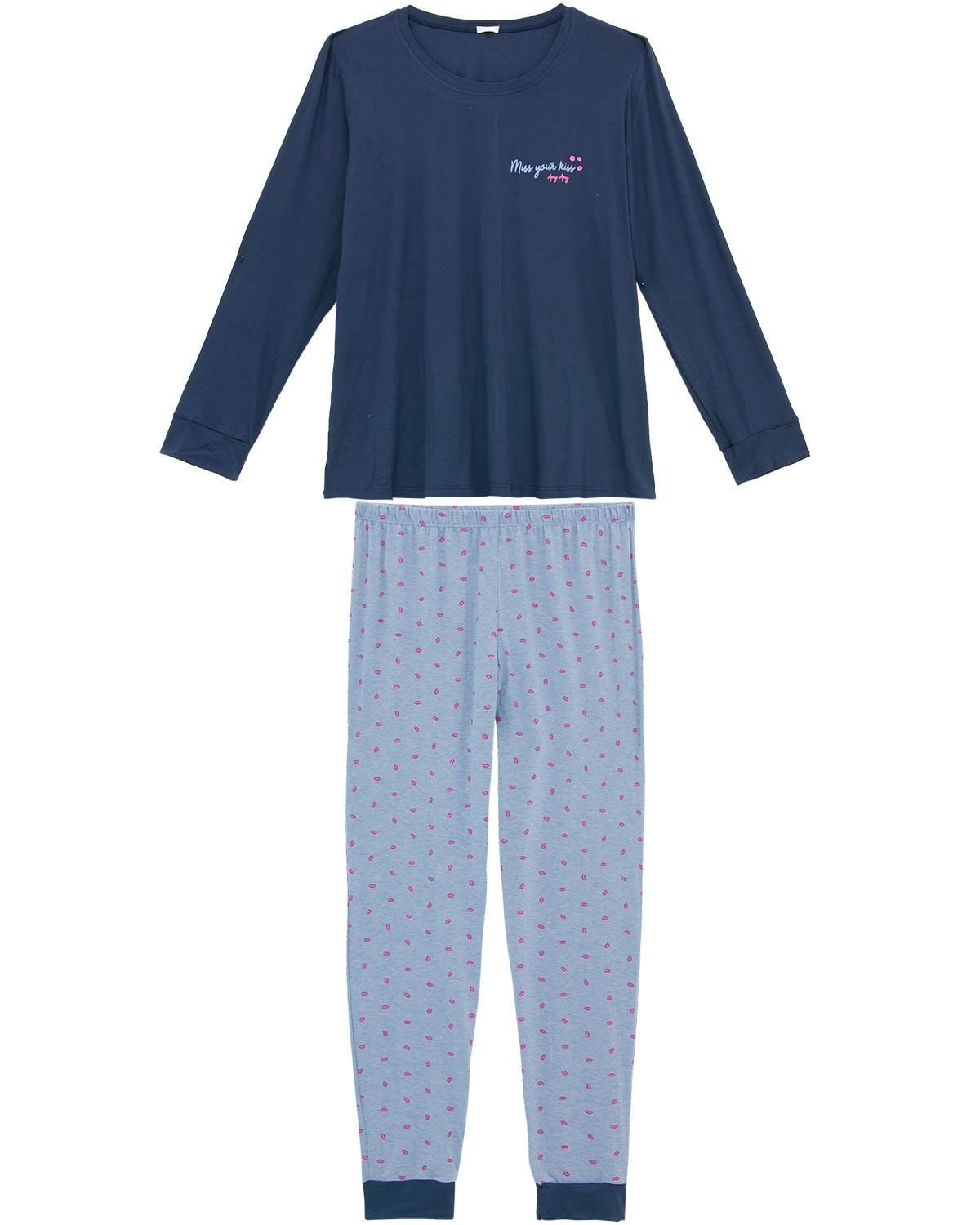Perfeito para se sentir bem e confortável até mesmo nos momentos de descanso, esse pijama diferente e com uma estampa incrível, é essencial. Disponível nos tamanhos plus size, possui blusa de manga longa e calça com punho e estampa de beijos, proporcionando um visual fofo e moderno. O conforto é oferecido pela malha Visco Premuim, a viscolycra de escletente qualidade da Any Any, leve e com um caimento perfeito no corpo, ideal para as noites de temperaturas mais amenas.
