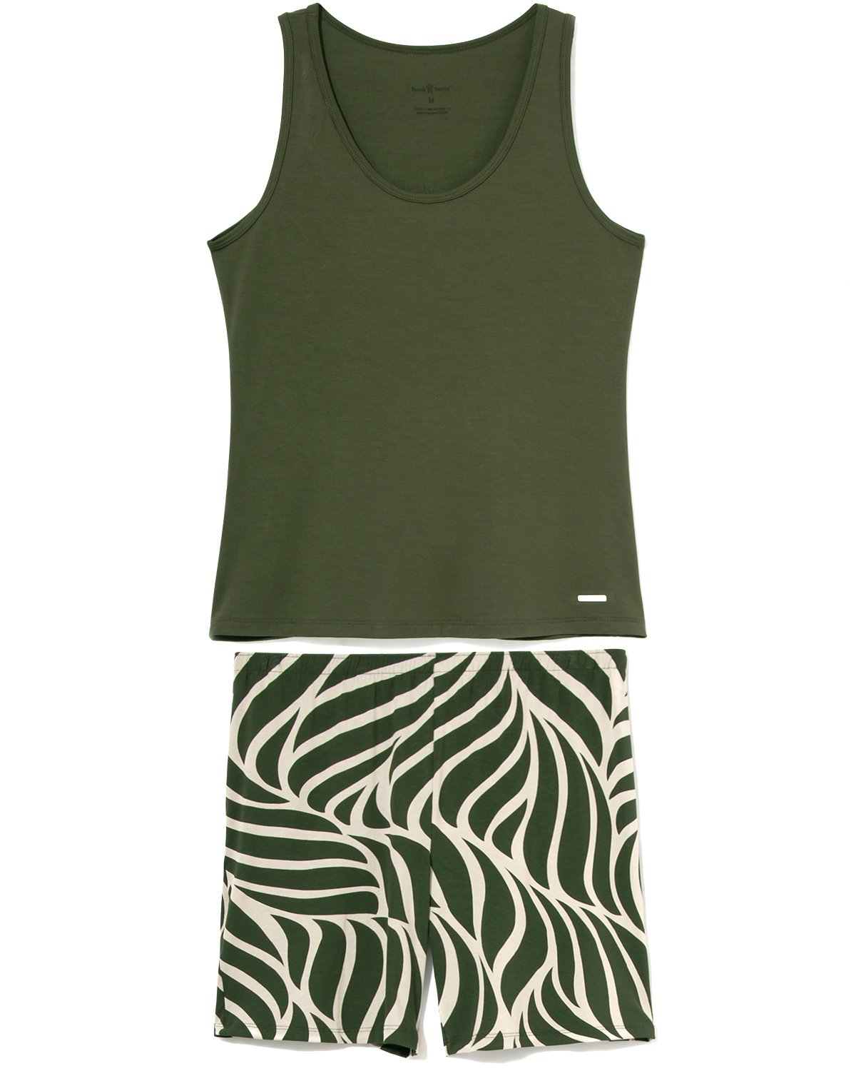 O conjunto traz uma blusa regata com alças largas e detalhe em courinho. A bermuda estampada completa o visual que é a cara do verão.