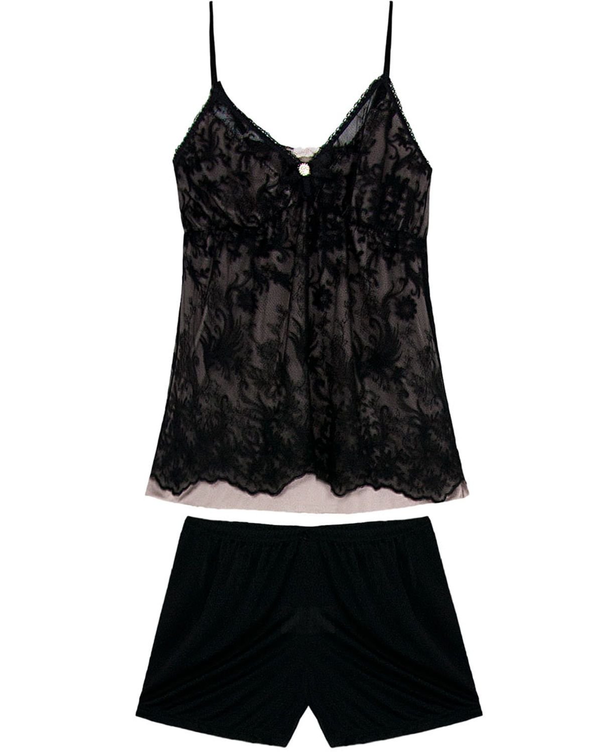 Surpreenda com este short doll todo trabalhado em renda preta e forro em micro fibra nude, dando a impressão de transparência e dando ainda mais sofisticação a peça. Com alça fina regulável e short em microfibra curto, é a peça ideal para noites especiais com muita feminilidade e sensualidade na medida certa. Destaque para pingente com strass e laço de cetim aplicados no busto.