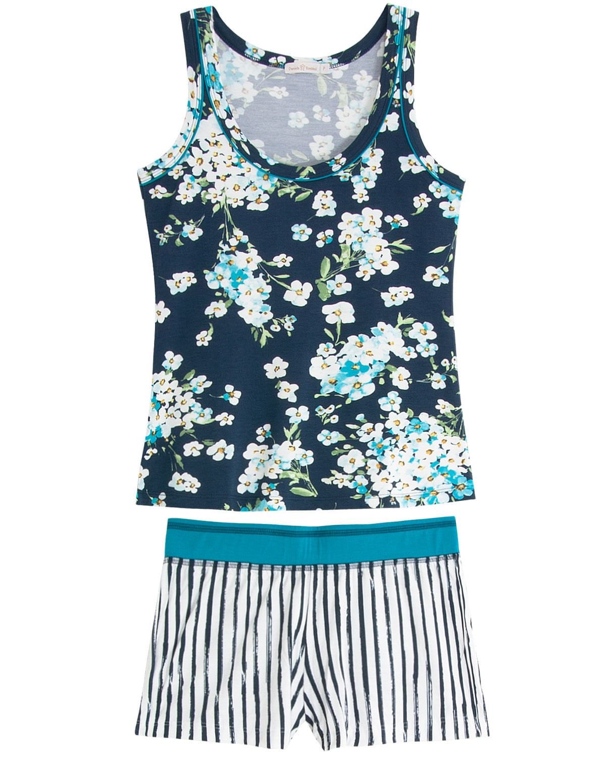 Aquele aconchego necessário, 10 entre 10 mulheres elegem o short doll como a peça favorita na hora de relaxar. E este modelo em viscolycra de excelente qualidade, ganha cor e modernidade com o mix de estampas, floral na blusa regata e listras no short. Destaque para cós largo em cotton no short.