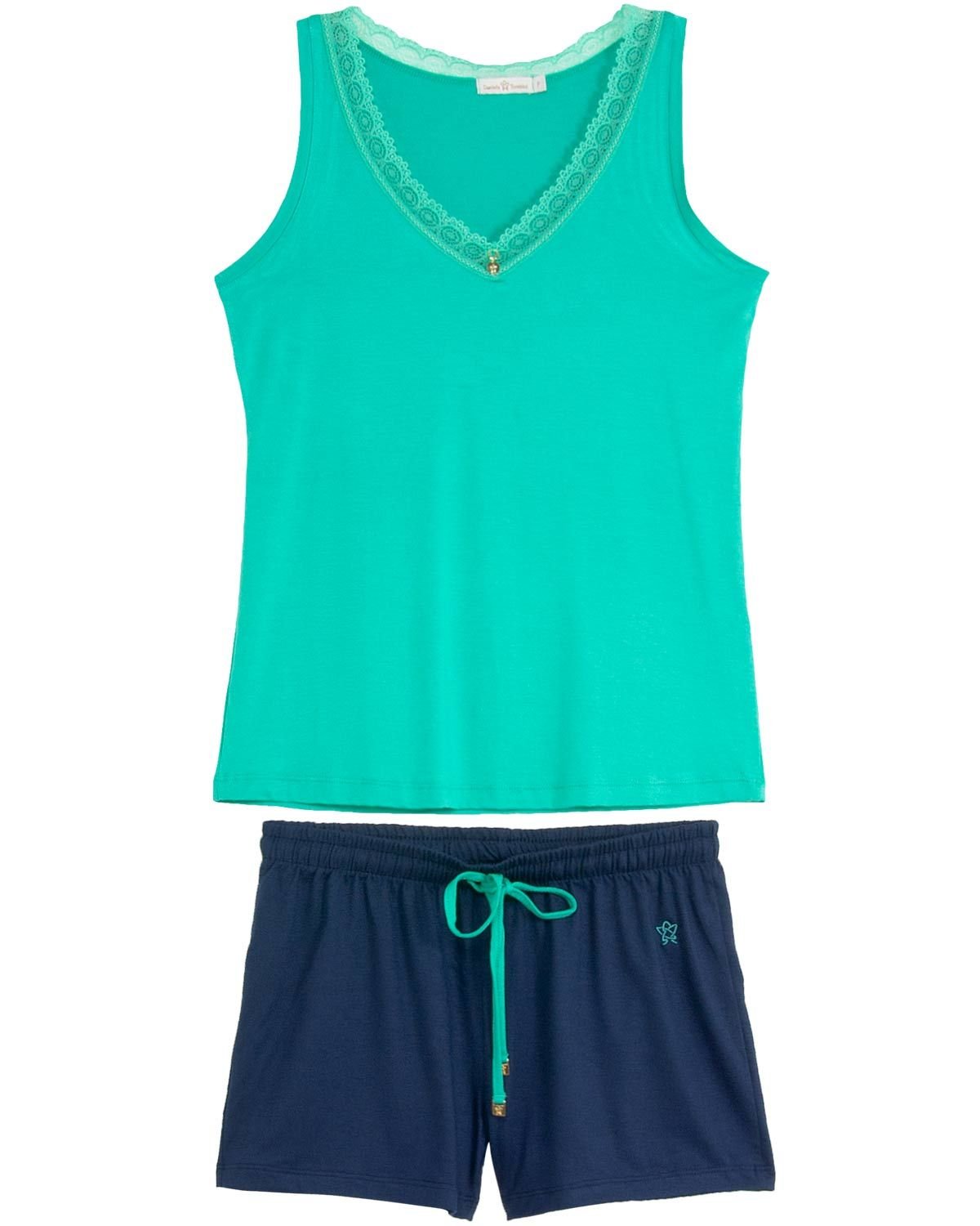 O short doll é aquela peça confortável e perfeita para o verão que toda mulher precisa ter em seu guarda-roupa. Esse modelo possui camiseta e short liso, em verde e azul, compondo um visual clássico, diferente e clean. Os detalhes que fazem toda a diferença aparecem na renda localizada no busto, junto com um pingente da marca, garantindo a feminilidade e o estilo que não podem nos deixar nem mesmo na hora de dormir. A malha toda feita em viscolycra garante o aconchego necessário e um caimento perfeito no corpo.