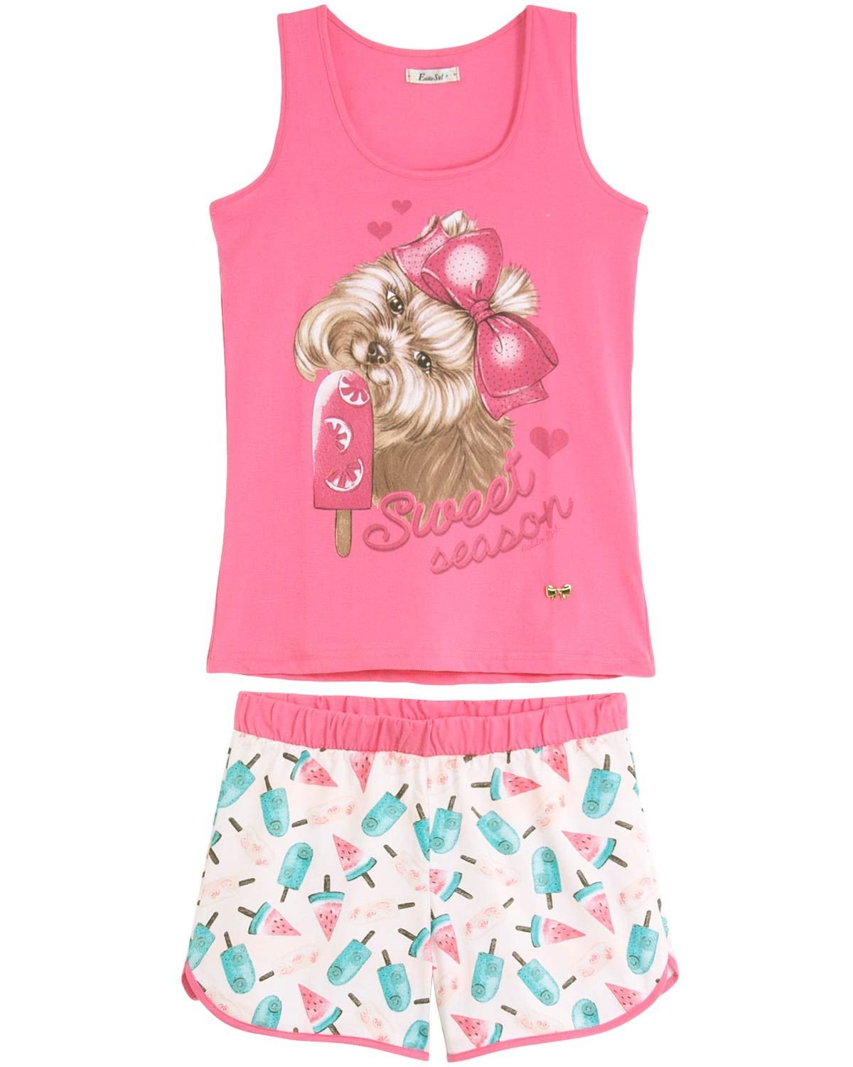 Um short doll confortável é a melhor opção para se ter uma ótima noite tranquila. Esse modelo possui camiseta regata com estampa de yorkshire e short com estampa de desenhos fofos, proporcionando um visual feminino e delicado. A malha toda confeecionada em algodão, garante o conforto, pois tem um caimento ótimo e não esquenta, tornando-o perfeito para ser usado nos dias de verão em que o calor toma conta.