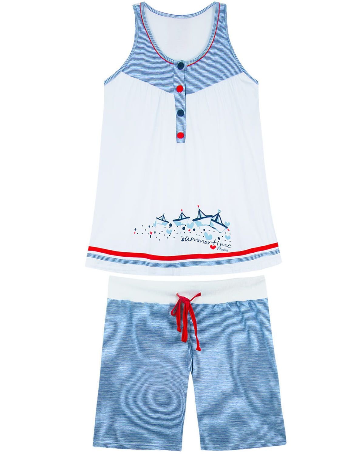 Com estampa de listras e motivos náuticos, este pijama trará modernidade e conforto para suas noites de sono. Com modelagem básica de blusa regata com bermuda, a peça torna-se ideal para viagens com amigos e familiares. Destaque para abertura com botões no busto, o que finaliza um visual feminino e delicado e torna-se ideal para amamentação e necessidades pós cirúrgicas.
